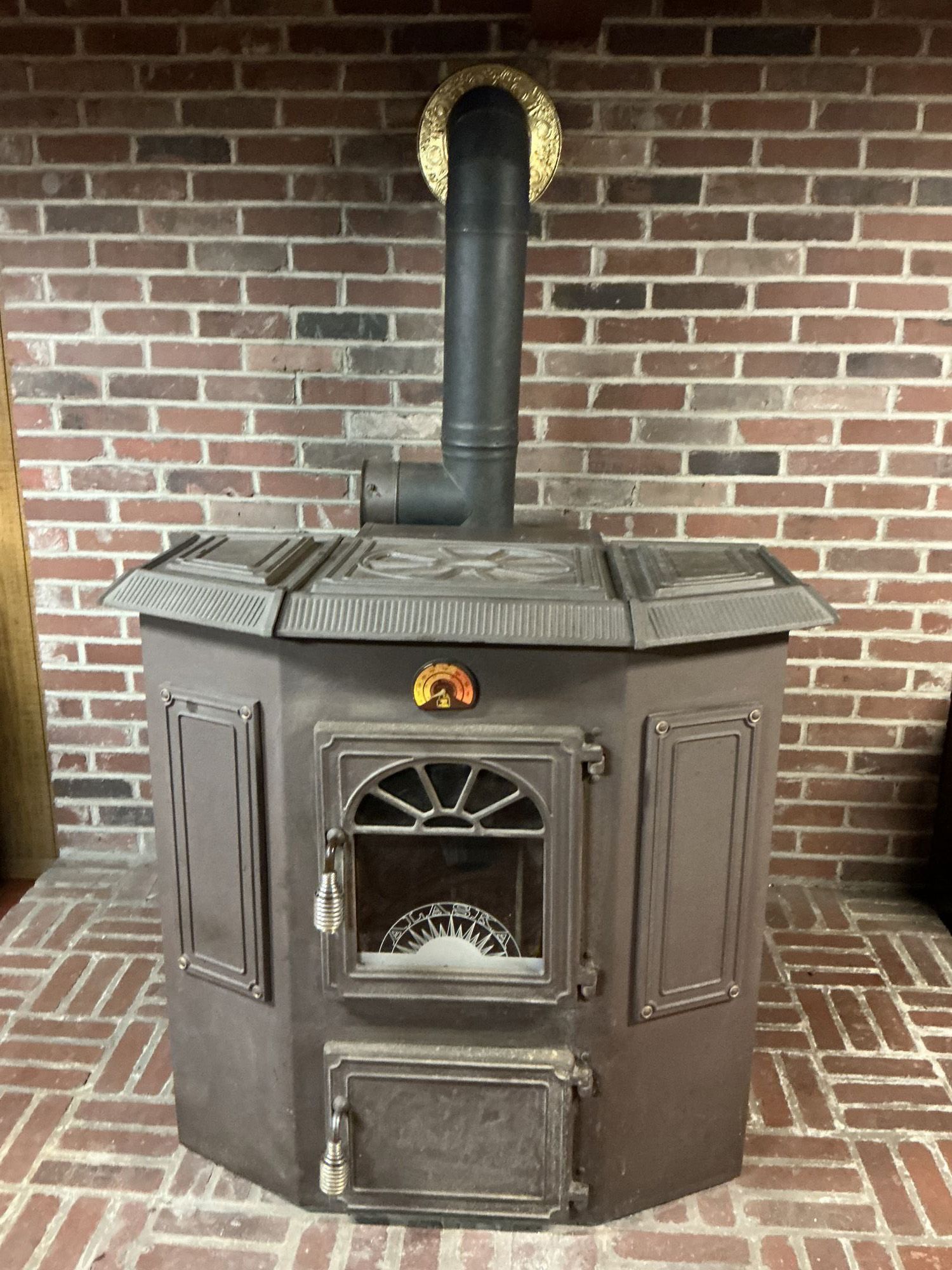 excellent condition, cast iron top & doors, brass handles, hopper holds 50lbs. rice coal, stainless steel ash bins included, +(OLD FORGE) Call Ray