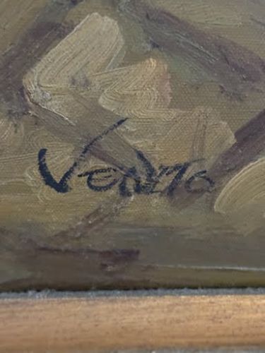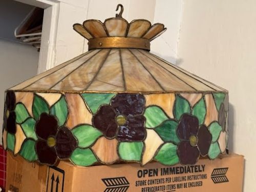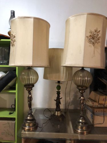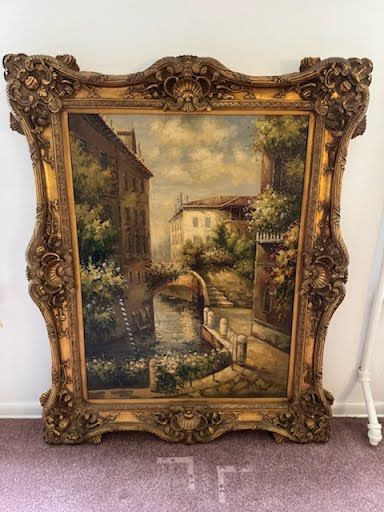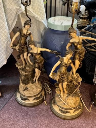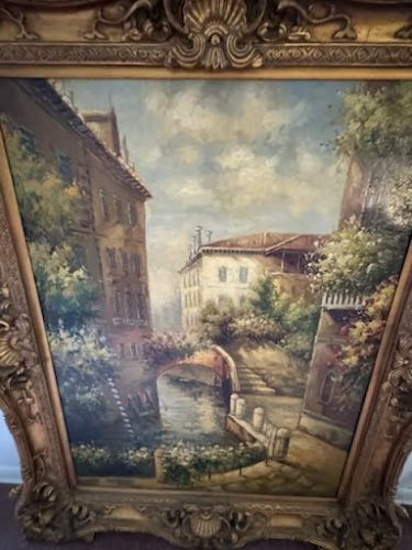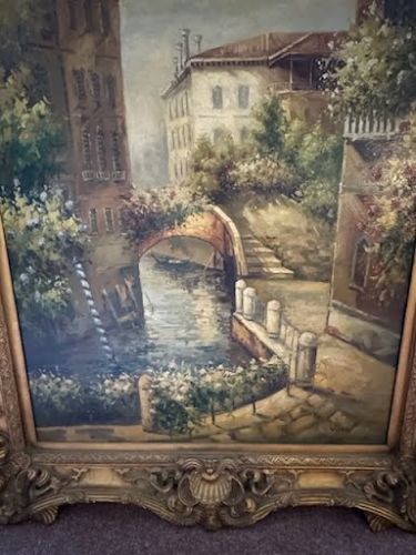$400.00; 41"x 61"H. Venzto Painting, $200.00; Bradley & Hubert Table Lamp, $800.00; Tiffany Type Flowered Hanging Dome Lamp, $400.00; 2-Art Nouveau Lamps, $150.00; +(CLARKS-GREEN)