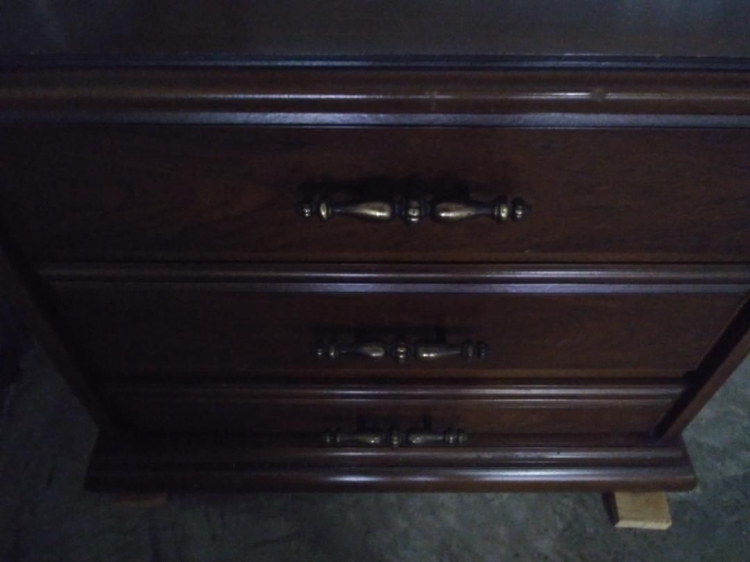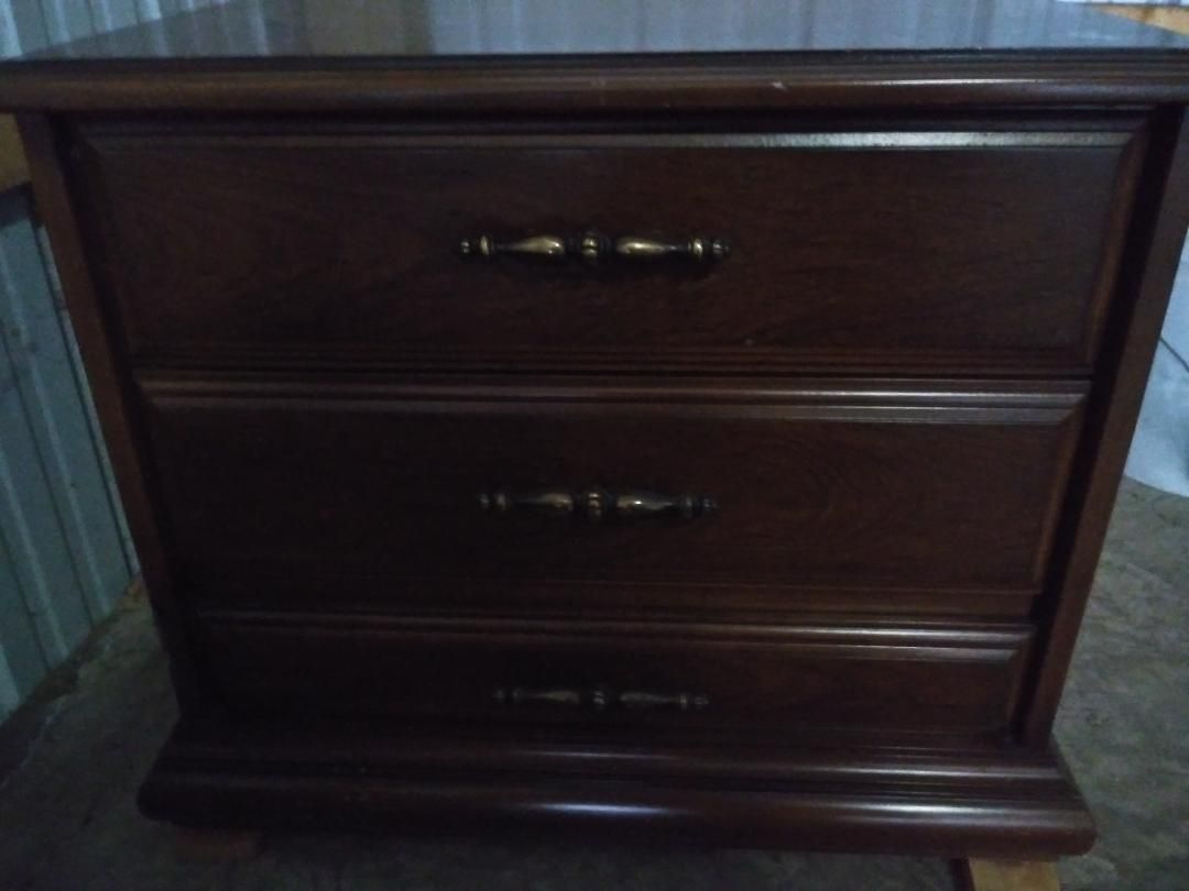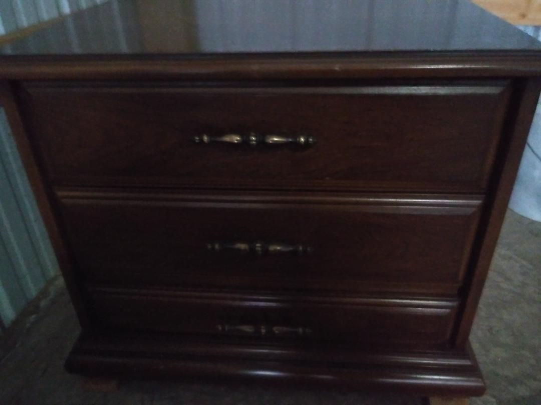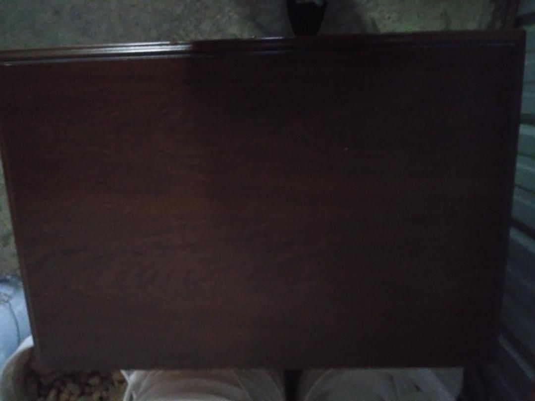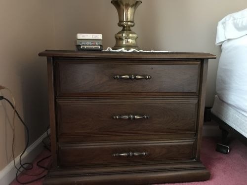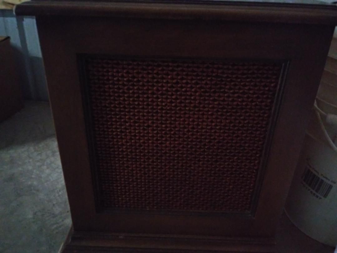 Solid wood with a glossy walnut finish, pull down radio, and an 8 track cassette player, unique tape player side table perfect for entertaining, great vintage condition and fully functional, everything works. +(ASHLAND)