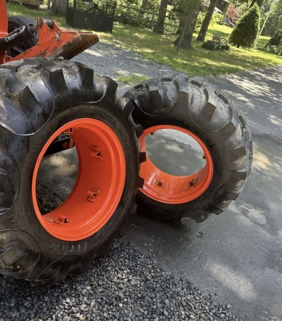 (2)17.5-24 R4 ballast filled and (2) 10.0-16 R4, all mounted on Kubota Rims ,95% tread, will sell per pair also +(CHILDS)