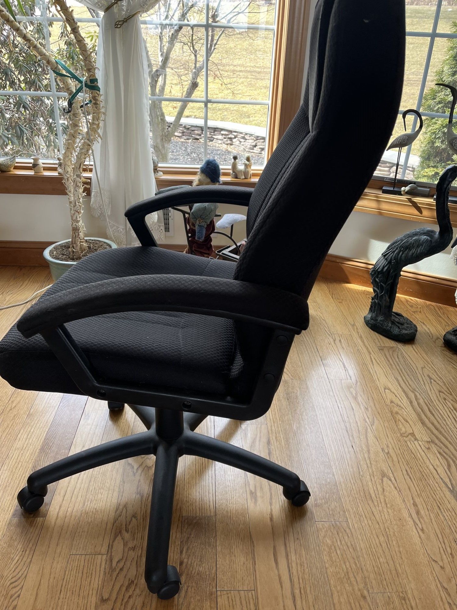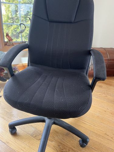 Swivel, black fabric covered, adjustable height and back, arms, nice condition, looks good and works well +(TUNKHANNOCK)