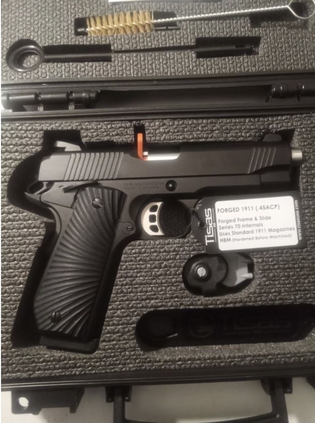 Factory new, in box, forged steel frame and slide, stainless steel barrel, Series 70 internals, 2-8 round mags, sunburst grips, very tight slide to frame fit, built like a tank, very nice. Cash only. No trades +(KINGSTON) FIRM