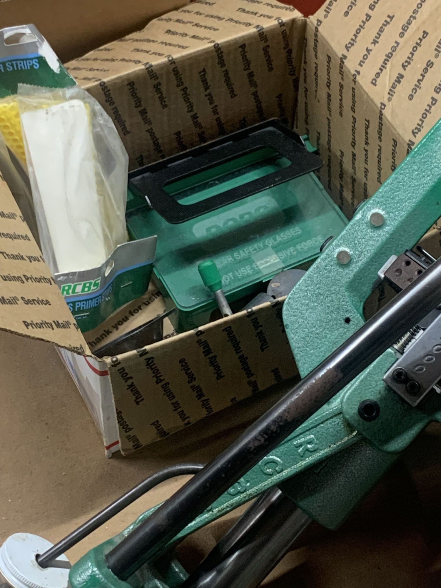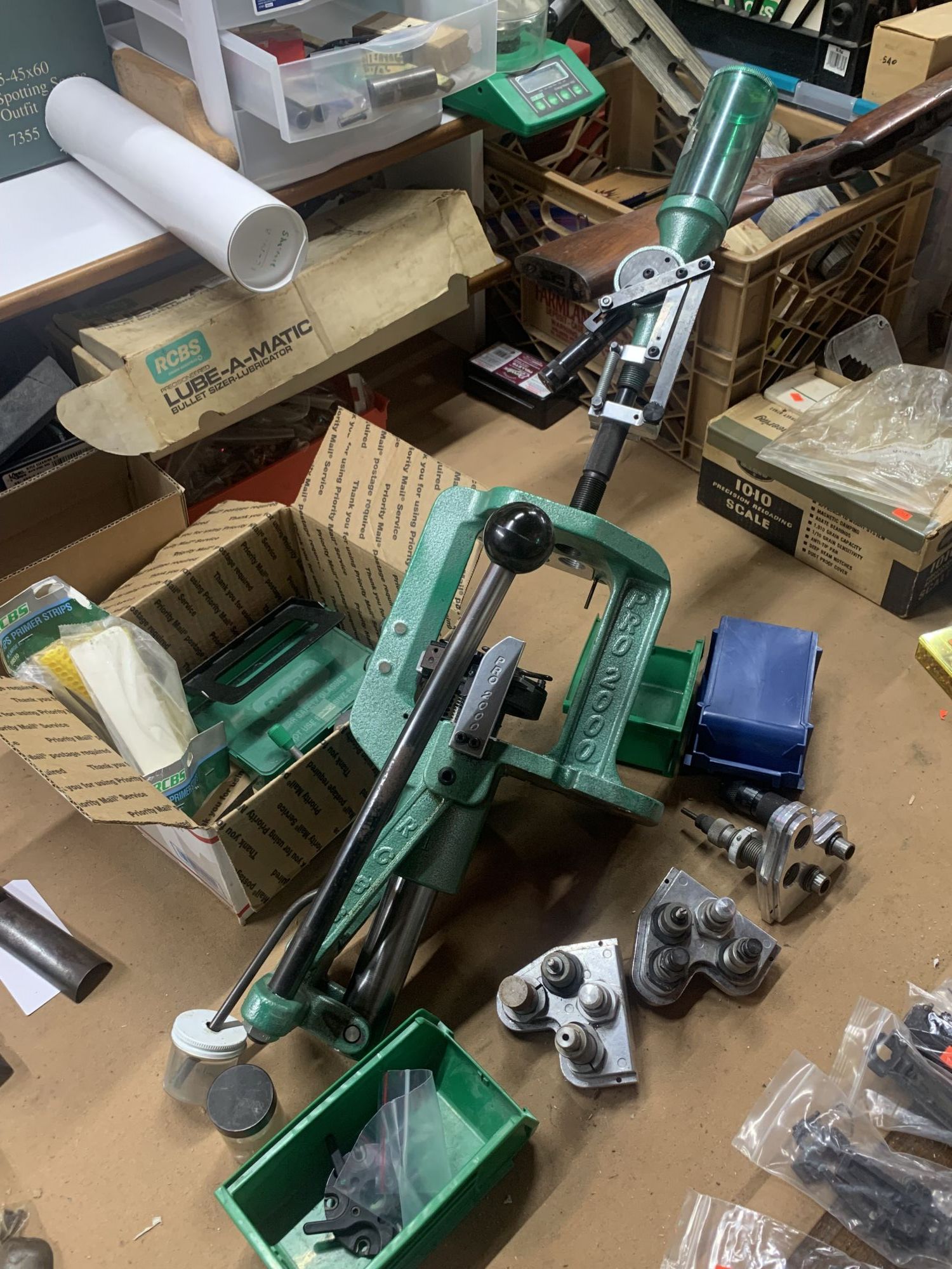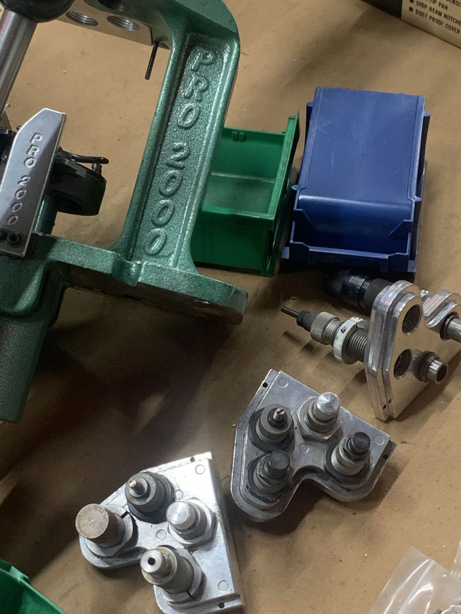 maual, strip loader, dies, plates and shell holders for 45 acp, 9mm and 308 Win. +(STROUDSBURG)