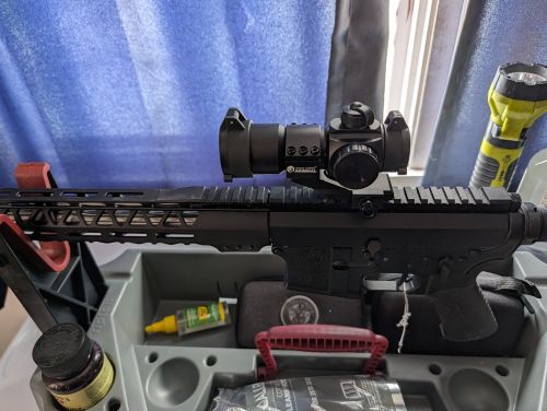 new, in box, red dot, green dot, side charge handle, stainless steel barrel. +(FORTY FORT)
