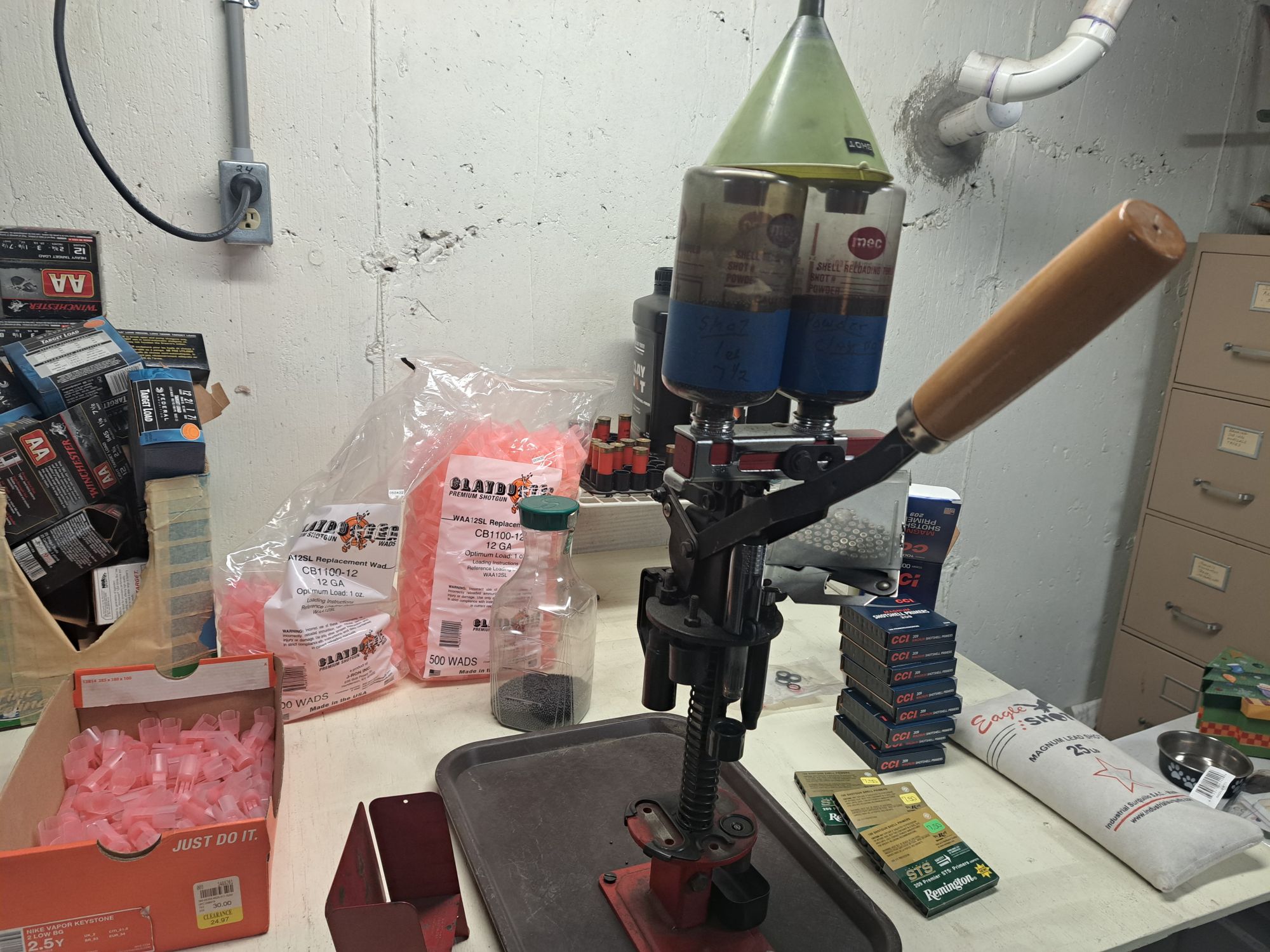 Includes 1-1/2 boxes primers, 1- full bag 7-1/2 shot, 1/2 bottle Clay Dot powder, lots used shells +(WHITE HAVEN)