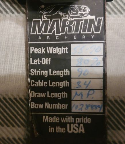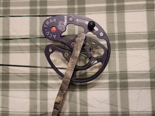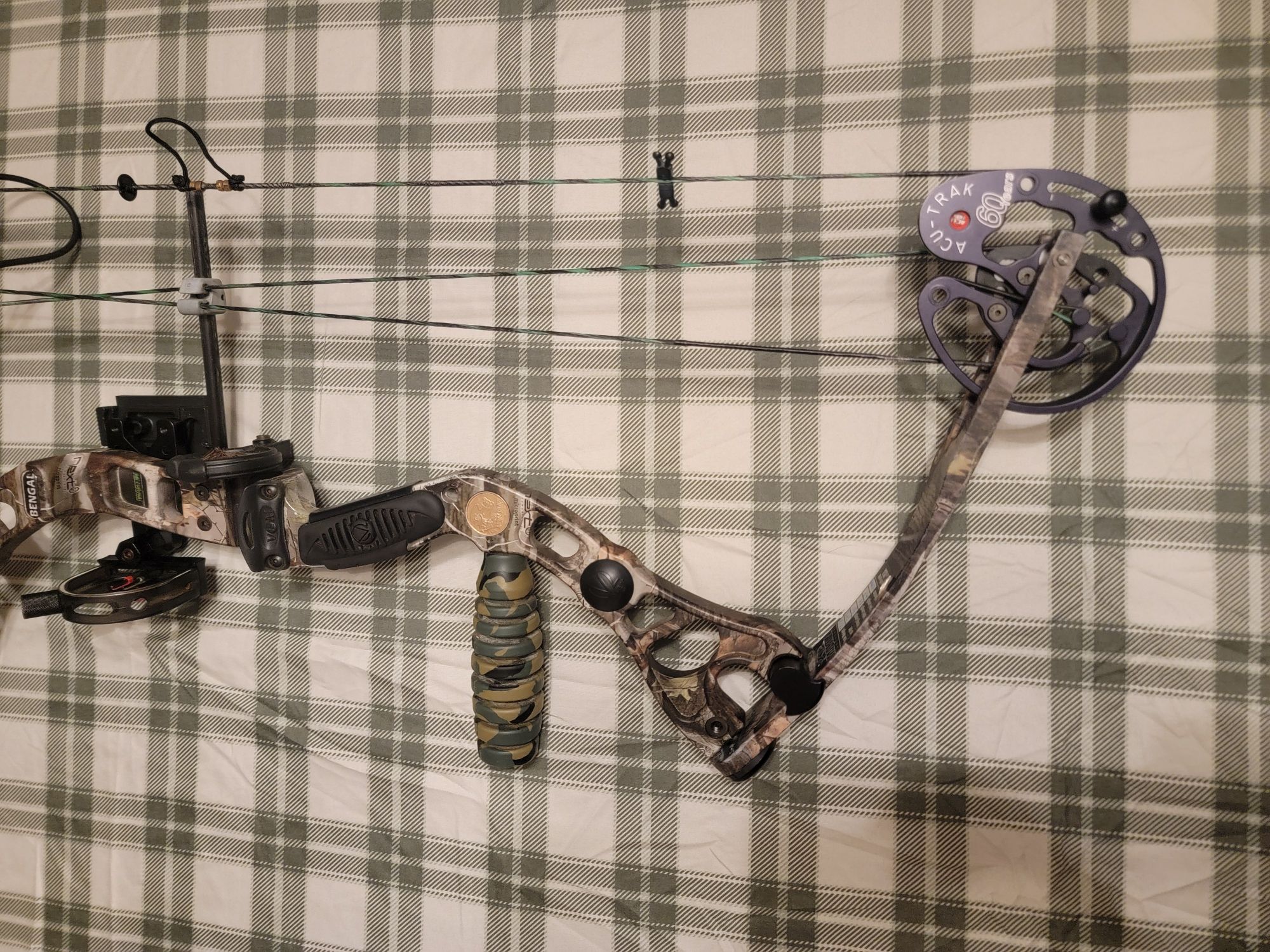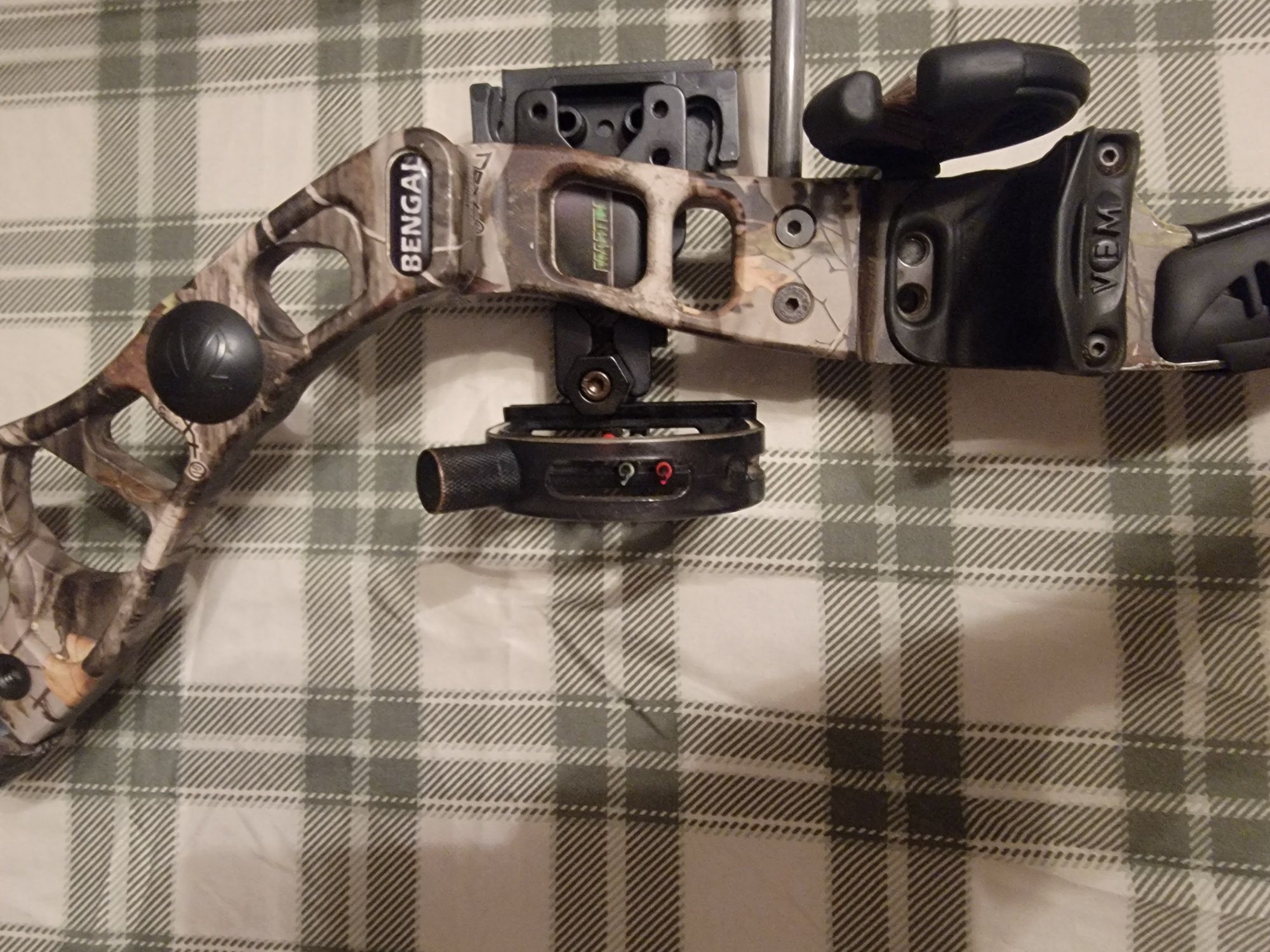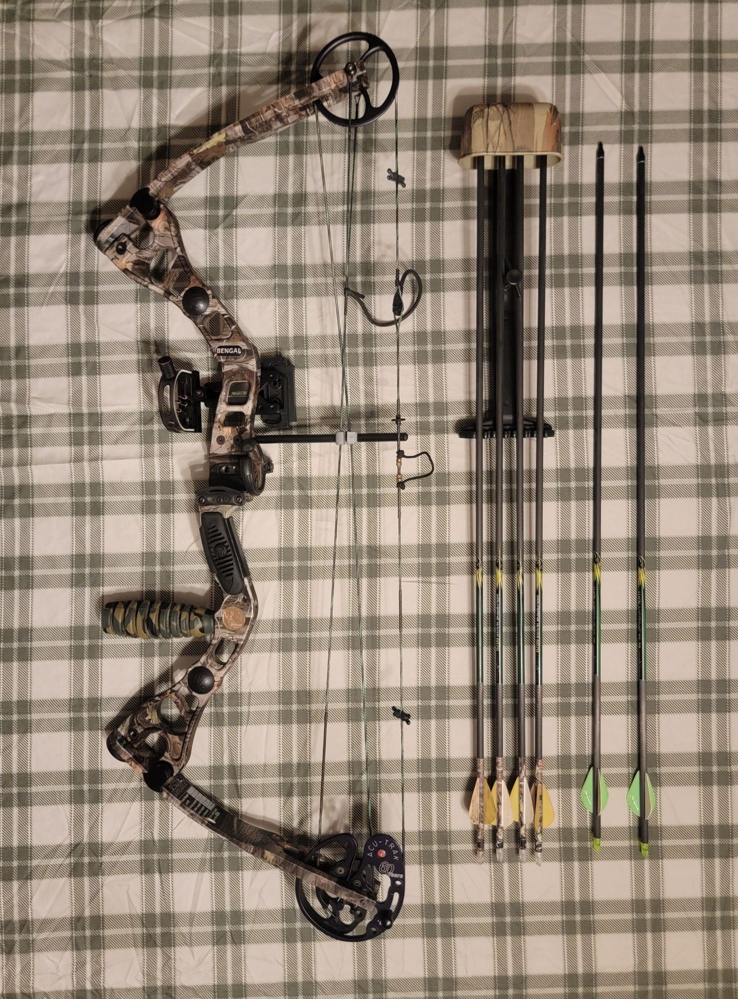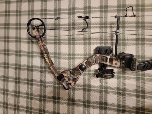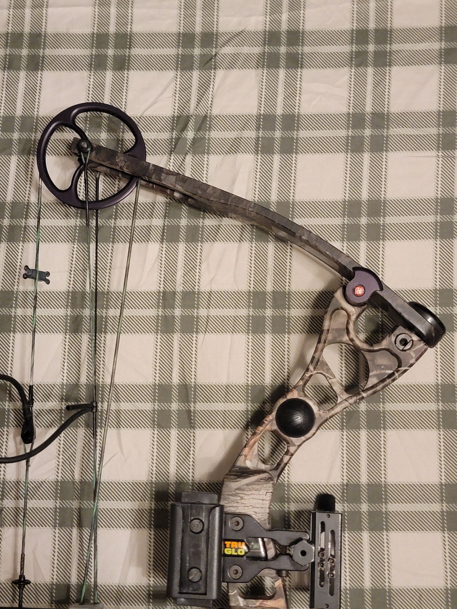 With Eastman Oudooors quiver (cracked), 6 Carbon Express arrows, Truglo sight, Trophy Ridge whisker biscuit camouflage stabilizer, shows some wear from use, overall good used condition. +(BLOOMSBURG)