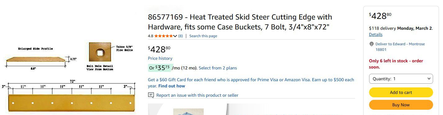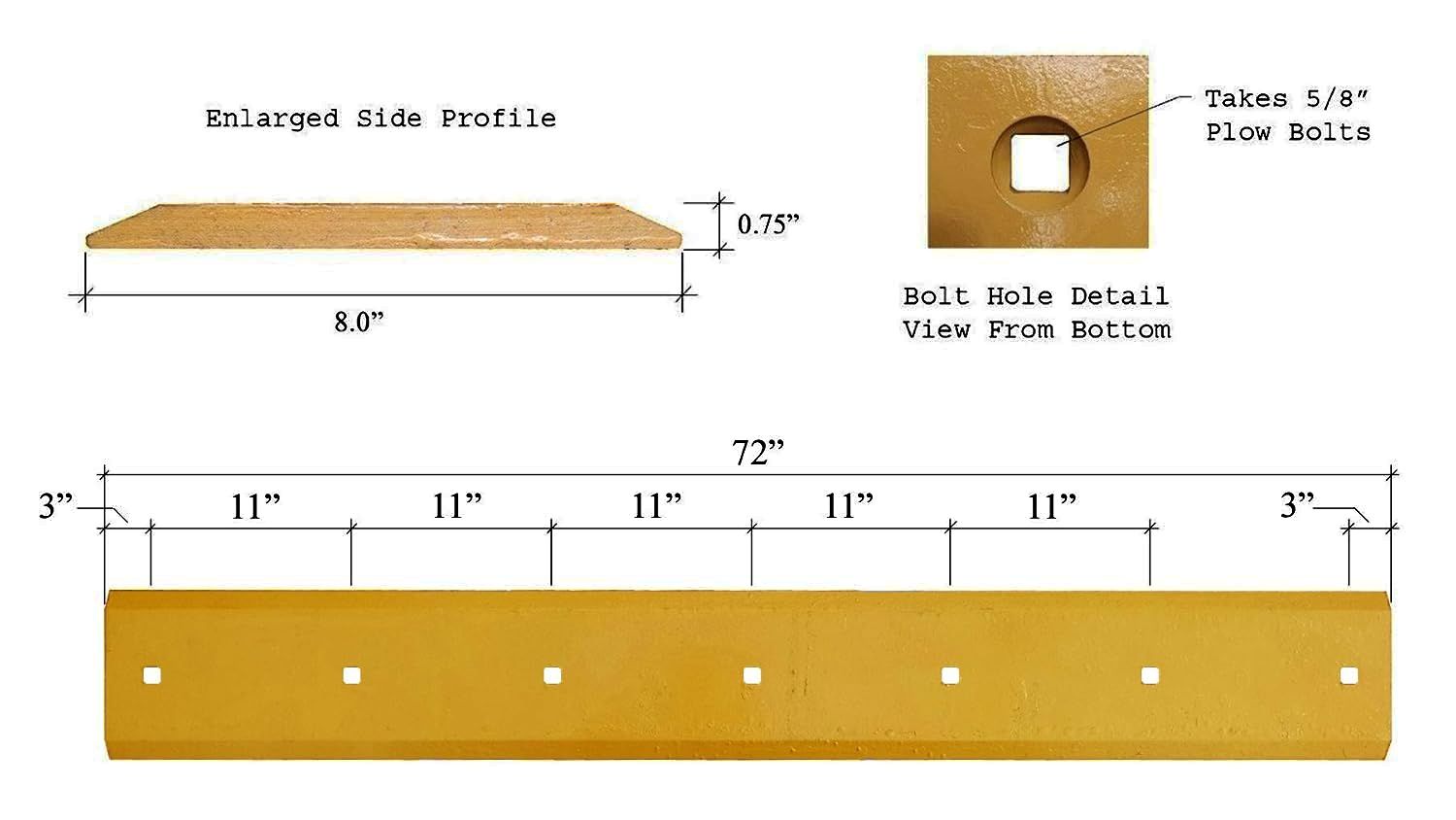 Unused skid steer or tractor heavy duty 72” bolt on double bevel (reversible) cutting edge, 8” wide, ¾” thick. First holes 3” from each end, 7 holes 11” center to center. +(MONTROSE)
