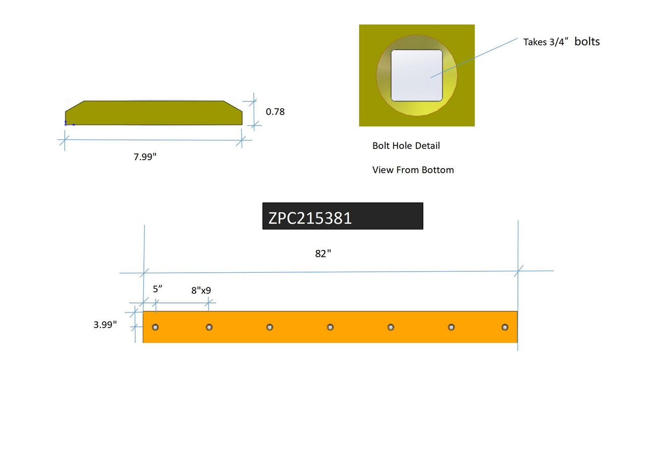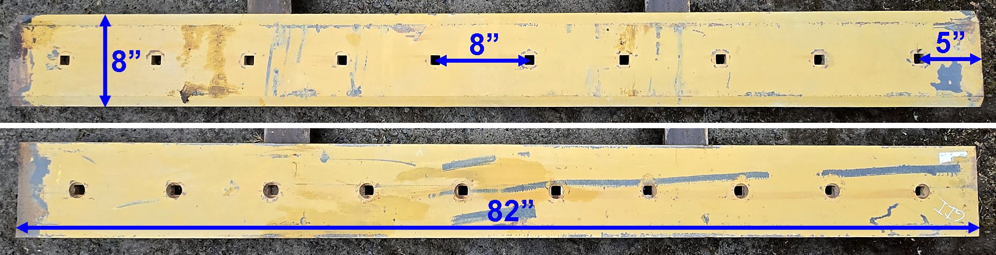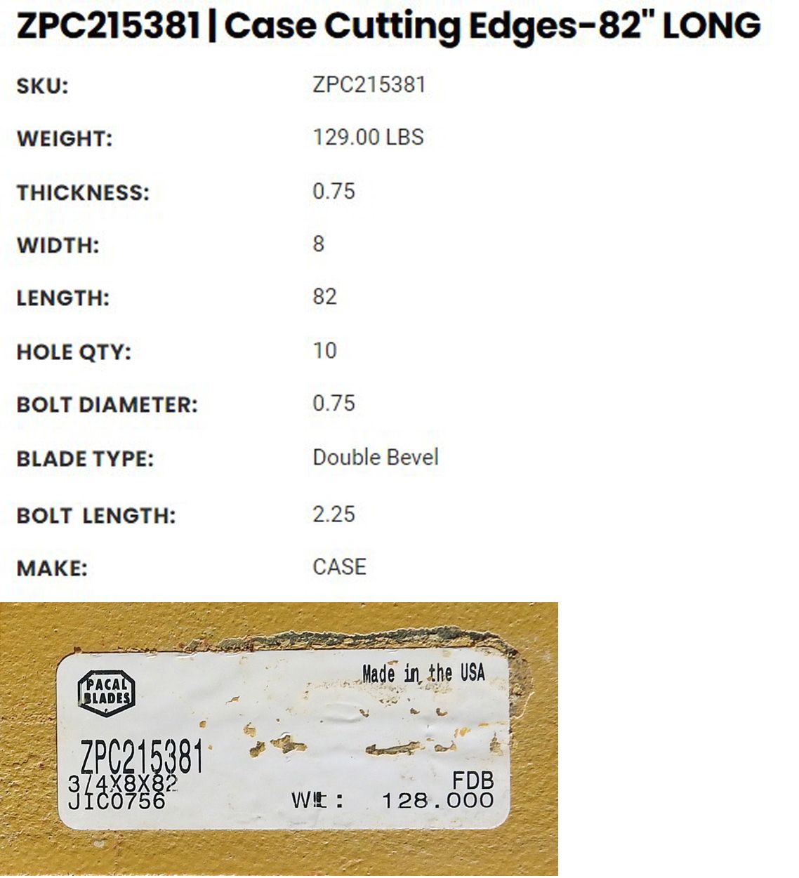 Unused Case ZPC215381 (82” x 8” x 3/4”) bolt-on double bevel reversible cutting edge. Can be cut for shorter length or drill a plain solid weld-on to match this pattern. Direct fit to Case 480 580 590 680 690. Made In USA. +(MONTROSE)