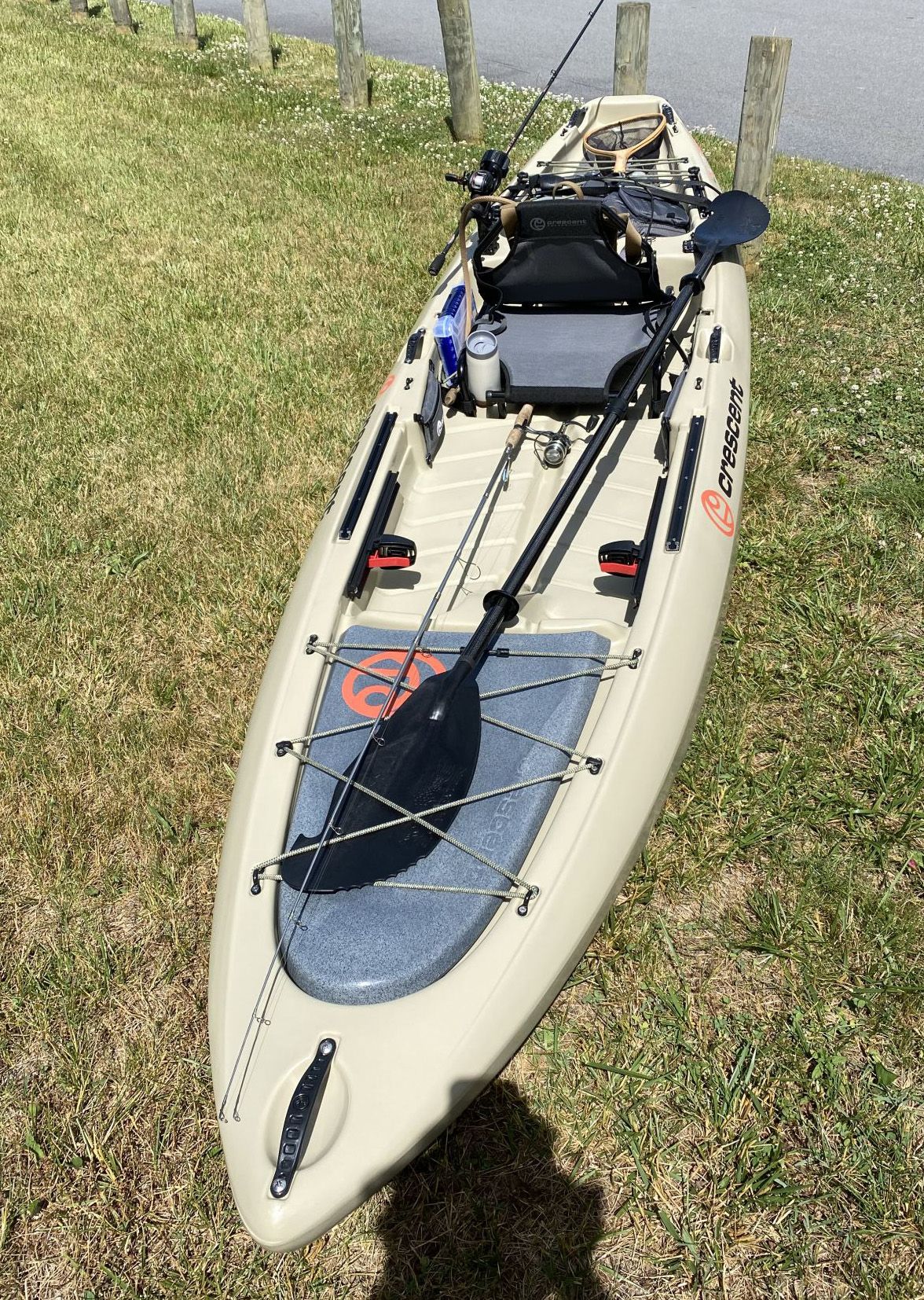 Crescent Lite Tackle w/seat and 2 YakAttack rod holders, Backwater Assassin paddle, NRS Chinook L/XL Fishing PFD, Packable kayak kart, Field and Stream Roof carrier. Kayak has some use but is still in great shape. Don’t use it like I wanted to. +(DALLAS)
