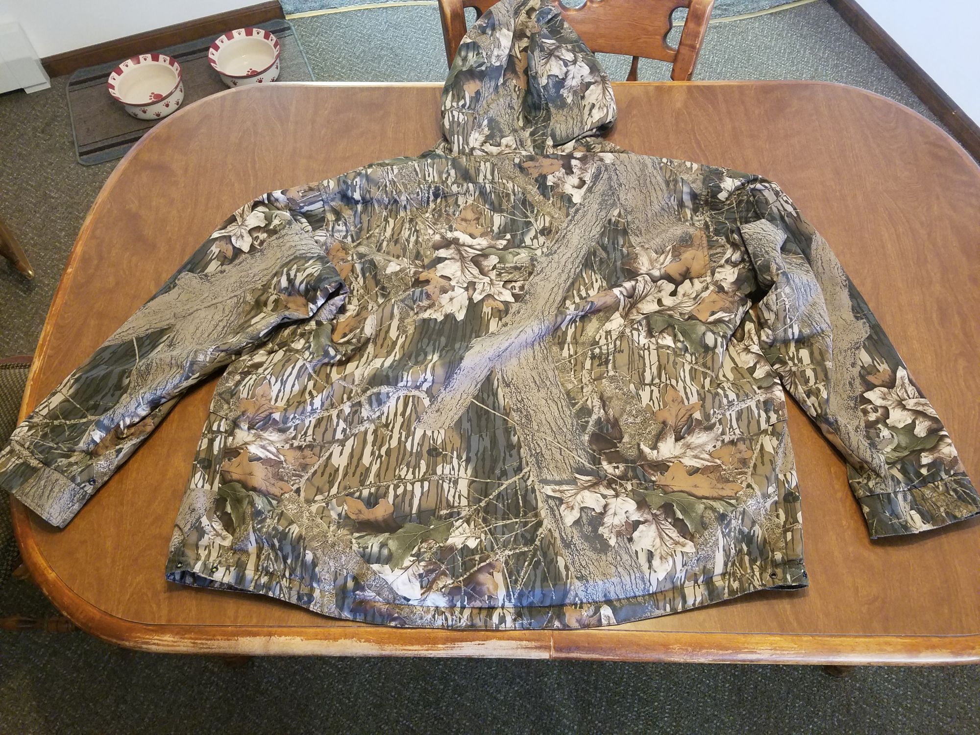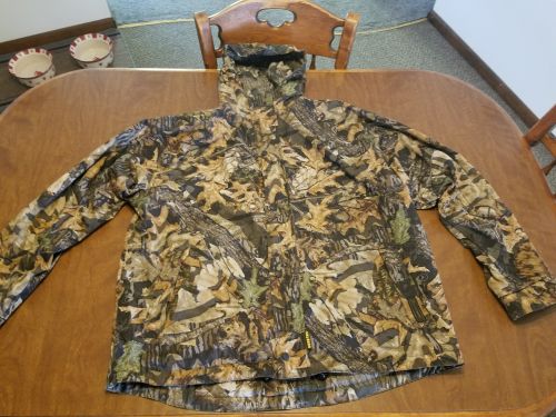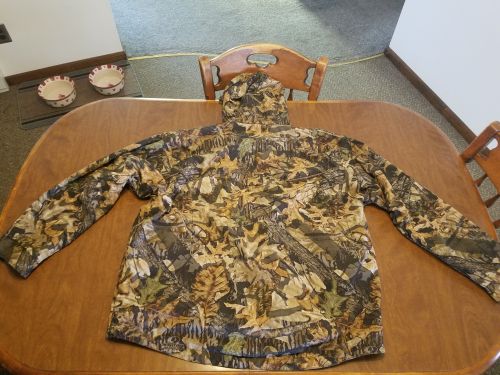 Reversible, hooded, with 2 camo patterns, 1 side Mossy Oak Breakup and 1 side Mossy Oak Forest Floor, packs into own stow pocket, size XXL, like nee, smoke free home +(MAYFIELD)