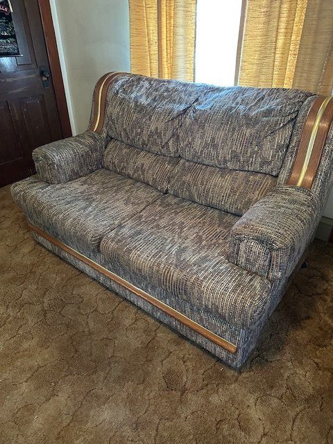 blue and gray, with wood trim, no rips or tears, very good condition, +(SCRANTON)