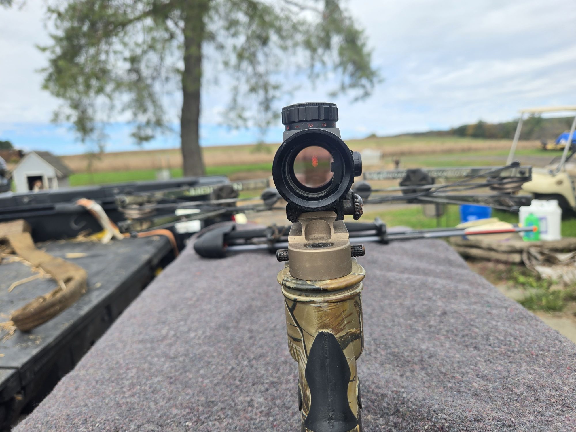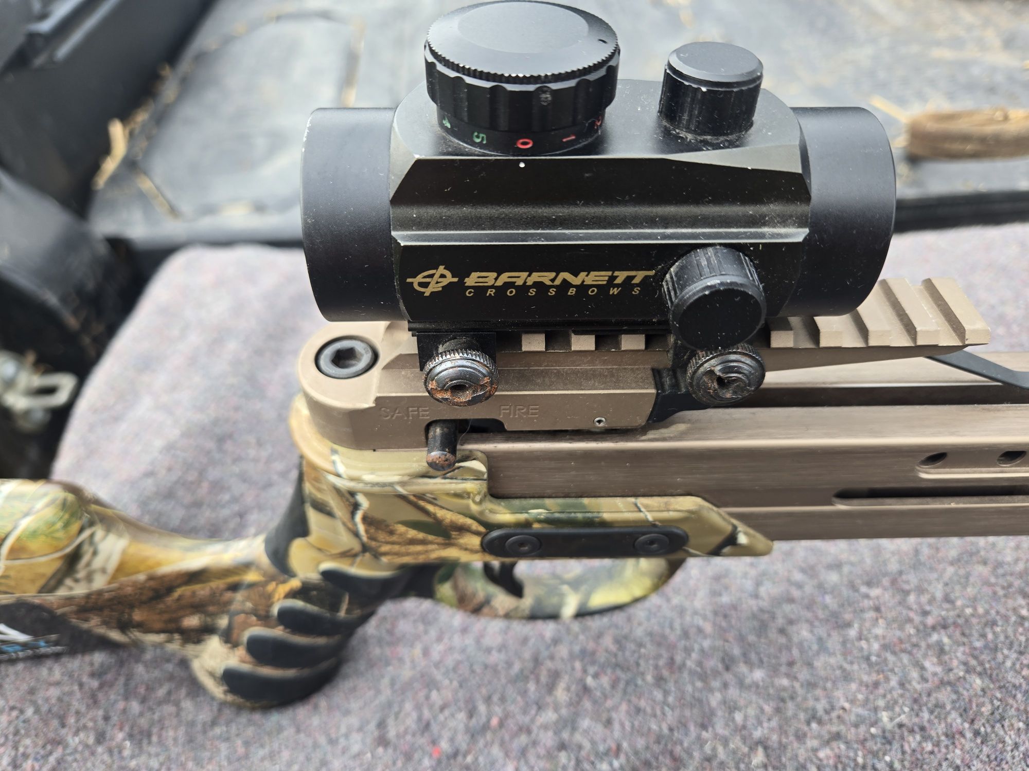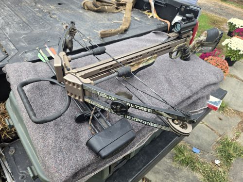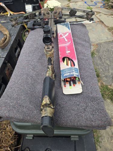 New string and cables, red/ green 3 dot sight, 330 fps, 175 lb. draw, very light and shoots well, with cocking device, bunch of arrows, few Rage broadheads. Text or call. +(ORANGEVILLE) OBO