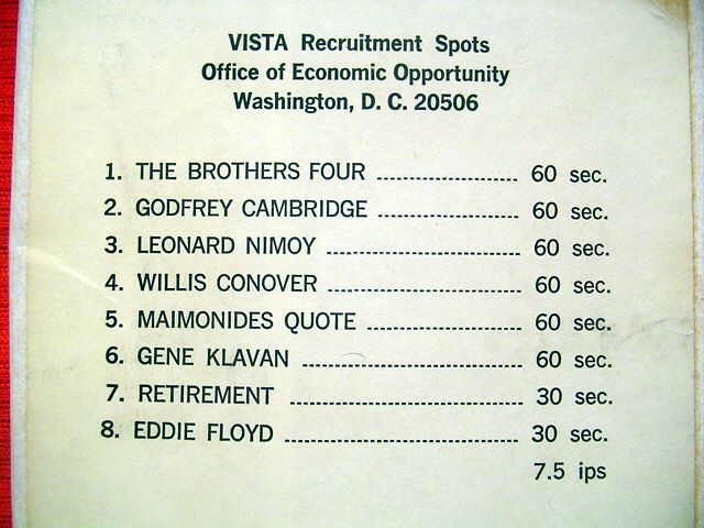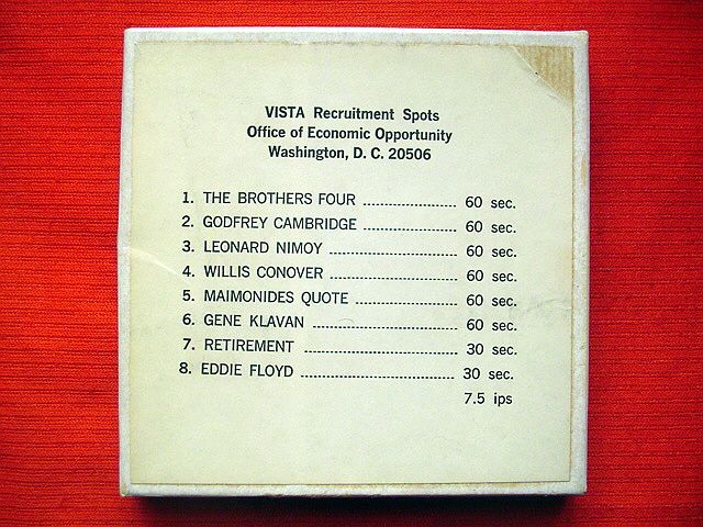 5 inch, featuring eight, 1 minute long public service announcement recruitment spots for VISTA (Volunteers In Service To America), featured in the ads spots are Star Trek's Leonard Nimoy, folk group The Brothers Four, R/B singer Eddie Floyd, and others, original tape that was used by radio stations in the 1970s to play these ad spots over the airwaves. +(RANSOM)
