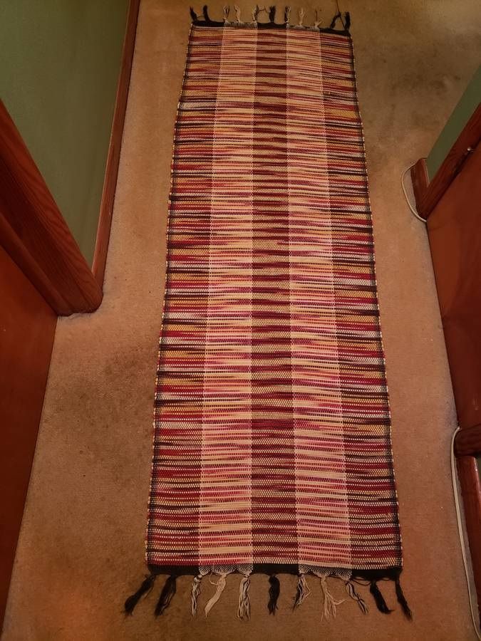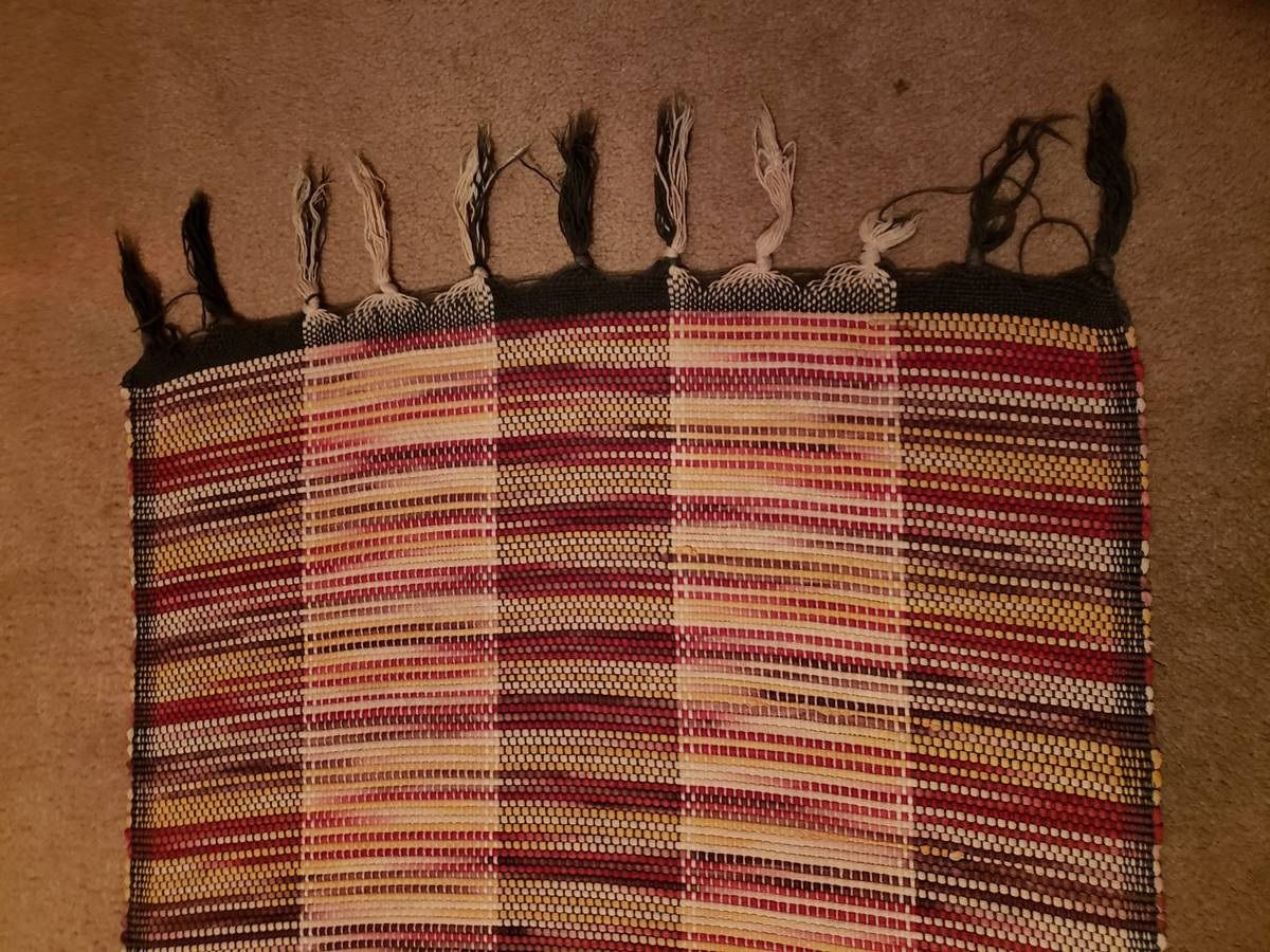 23"W., 67"L., approx. 2' wide by 5'7" long, rectangular, striped colors, made from soft cotton blend rags material, reversible, a versatile addition to any room in your home, handmade over 30 years ago, in storage since, with fringe detailing on each end +(RANSOM)