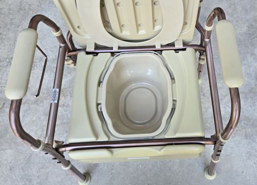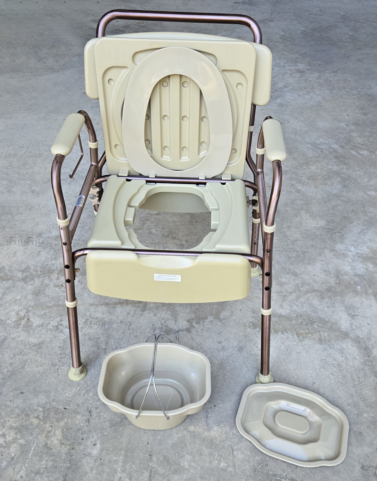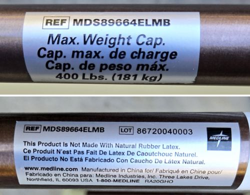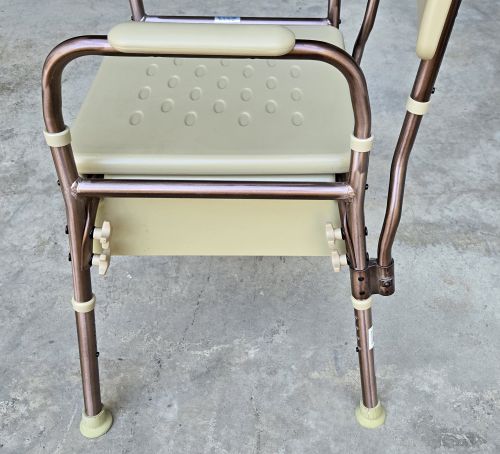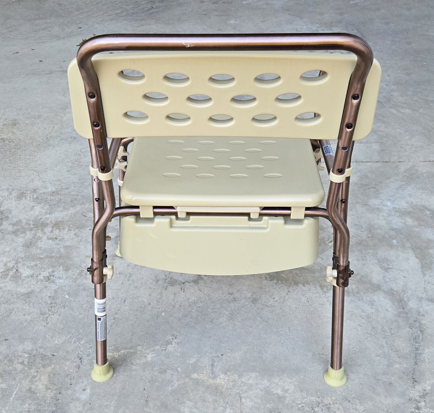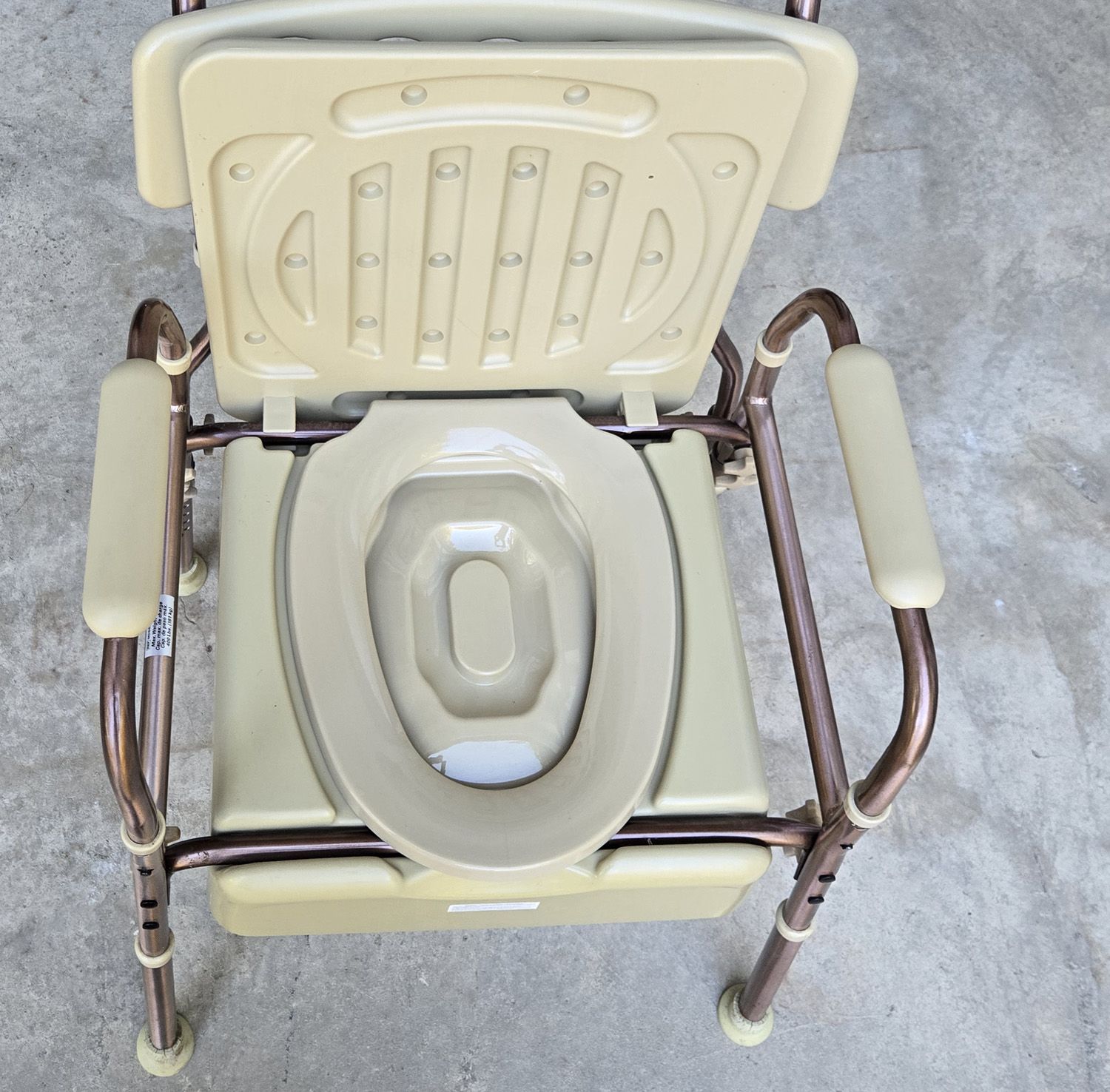 Unused, MDS89664ELMB, current premium model, Microban product protection reduces the growth of stains and odors from bacteria, mold and mildew, height adjustable seat and arm rests provide a customizable fit, flat-seat lid cover discretely conceals commode when not in use, can be used over toilet to raise seat, enhancing stability, splash guard included, one cosmetic issue- rubber feet are cracking, still firmly attached, no stability issues +(MONTROSE)