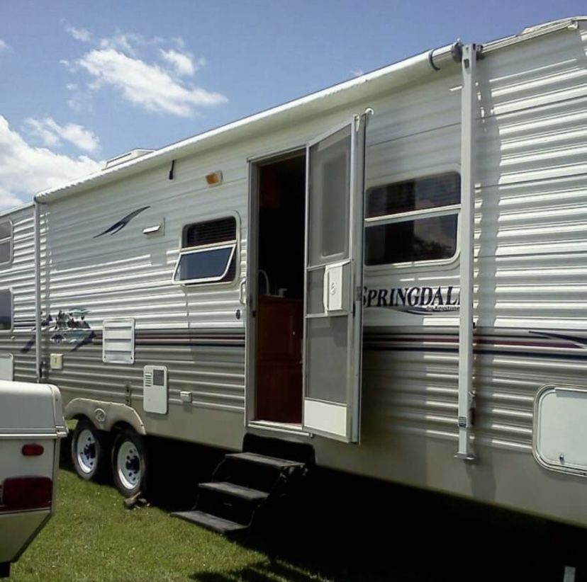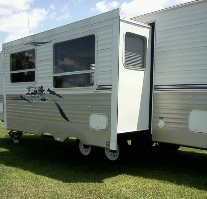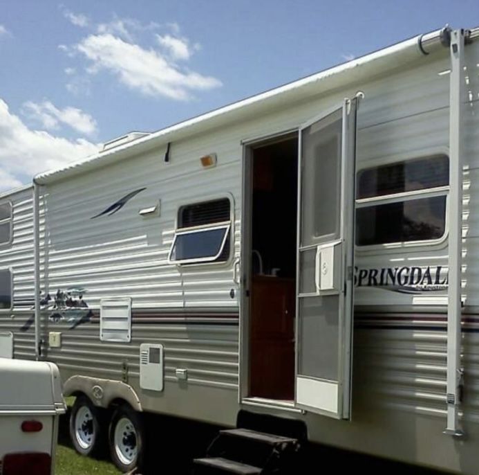 Sleeps 10, two double bunks in back bedroom, double bed in front bedroom, air conditioner and water heater work, includes golf cart, no awning, towing accessories included, titled, has large deck at site, will need TLC, serious inquiries only, includes golf cart, at How Kola and most likely should remain in the site. Text +(CLARKS SUMMIT) or make reasonable offer.