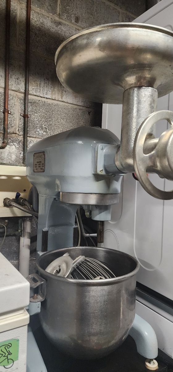 vintage 1970s, with newly re-tinned PTO meat grinder attachment, SS bowl, fully refurbished, by Hobart Tech +(MOSCOW)