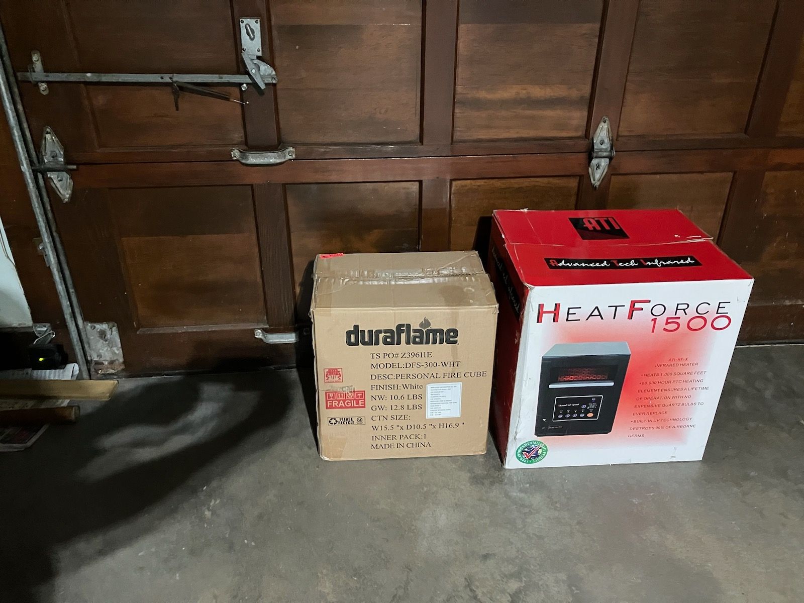 1-Heatforce 1500 infrared, heats up to 1000 SF, $75.00; 1-Duraflame Personal Firecube, heats up to 400 SF, $55.00; both like new, +(OLD FORGE)
