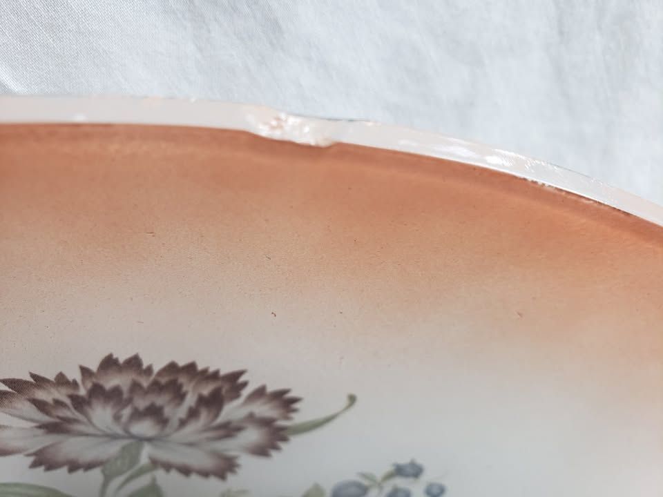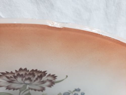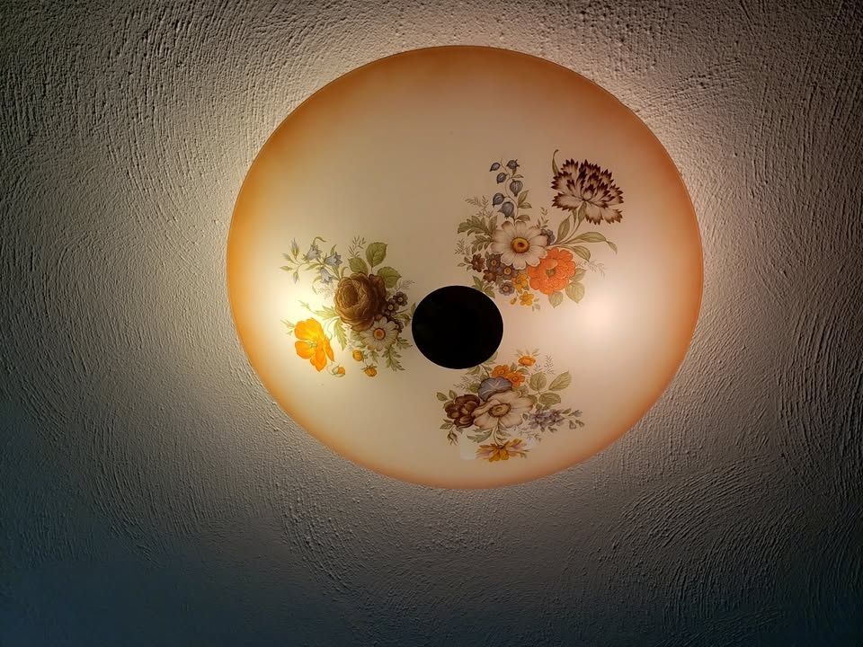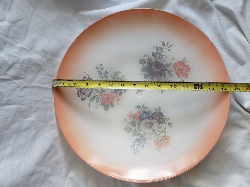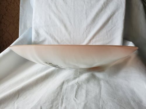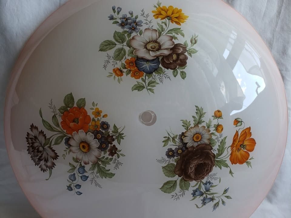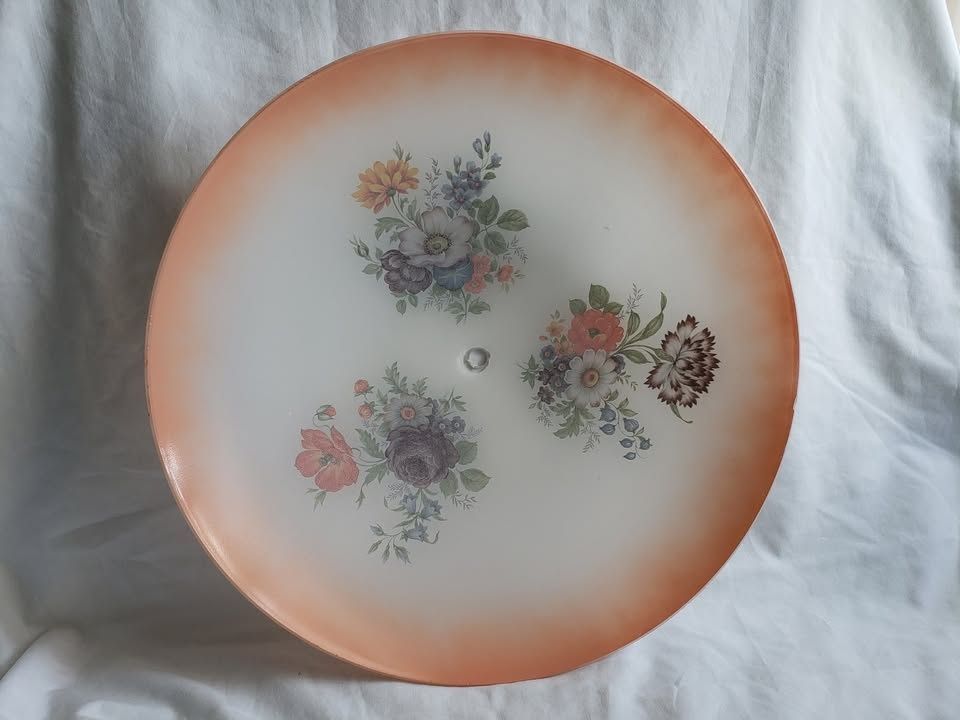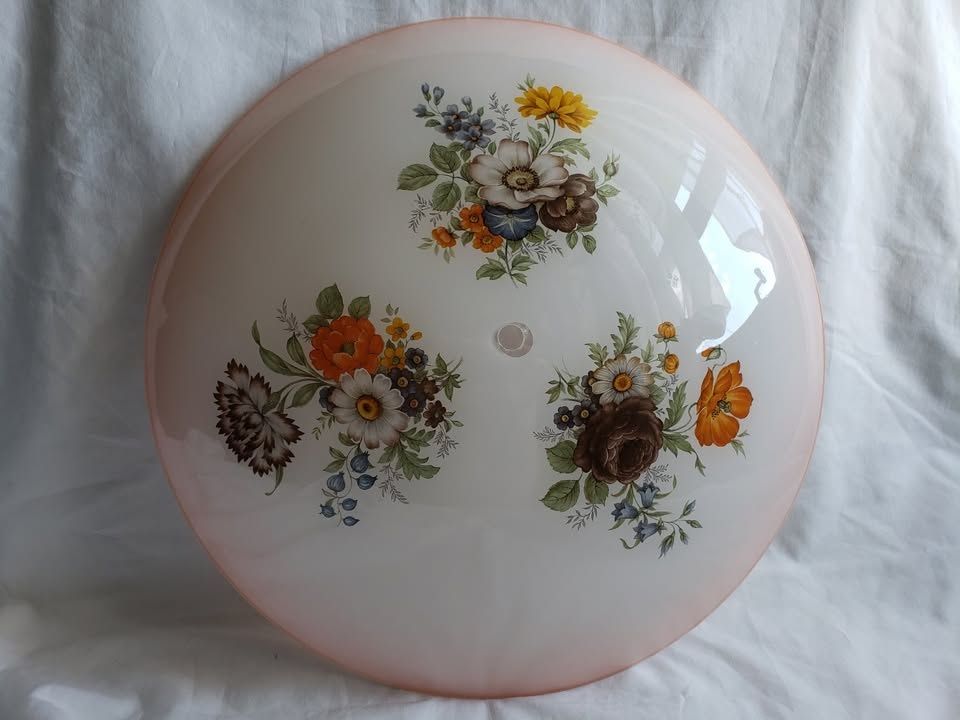 vintage, mid-century, large, round, measures approximately 14-1/2 inches wide, soft frosted finish with elegant floral designs, good condition, small chip on the edge that once mounted doesn't detract from the beauty +(RANSOM)