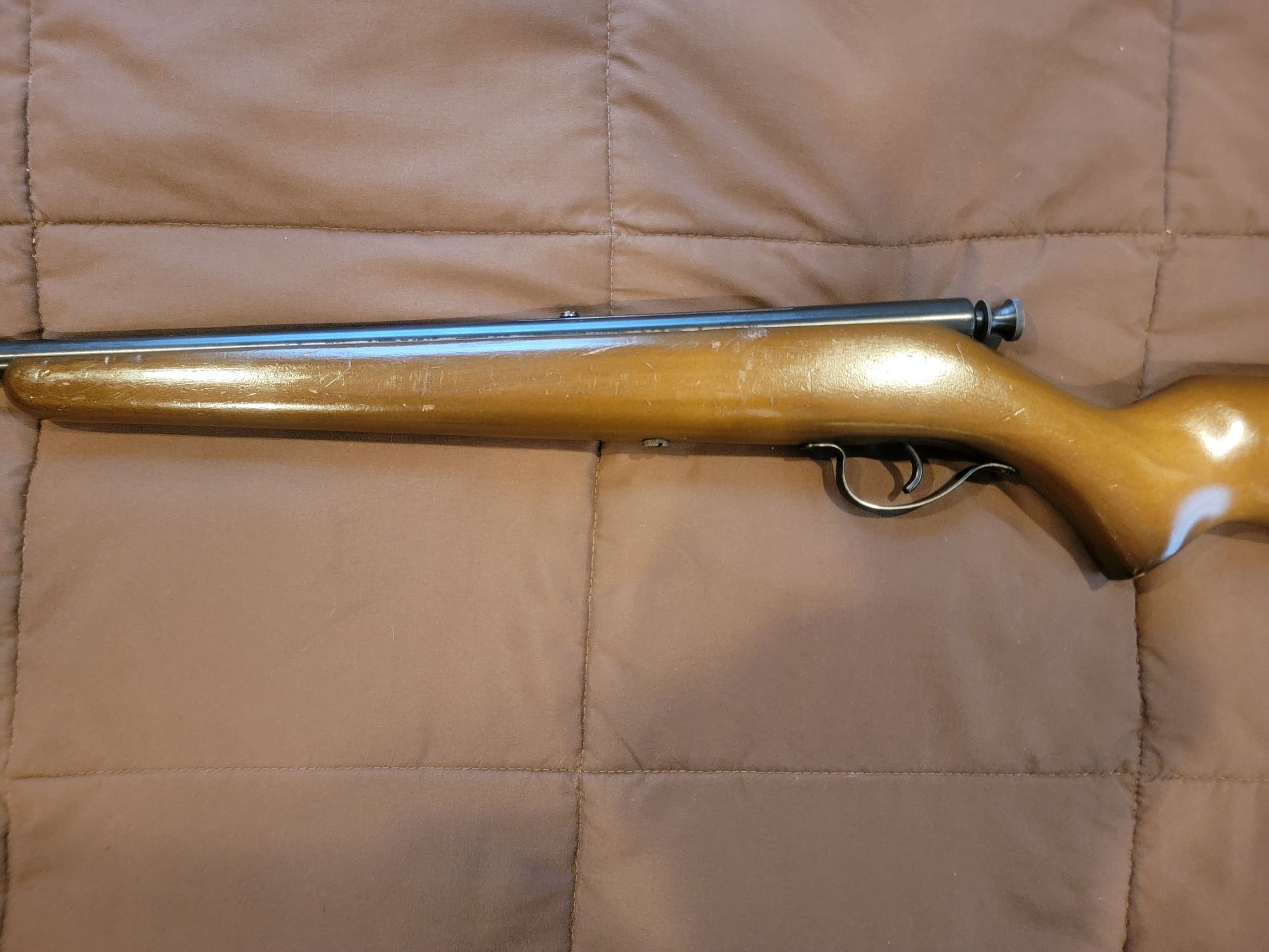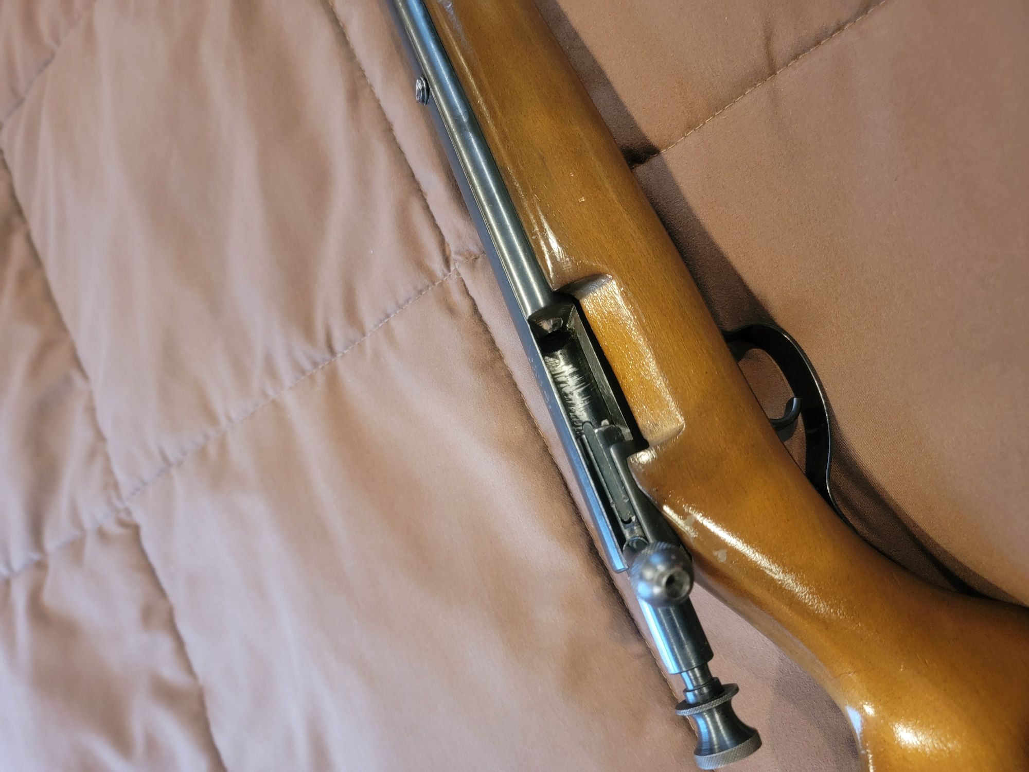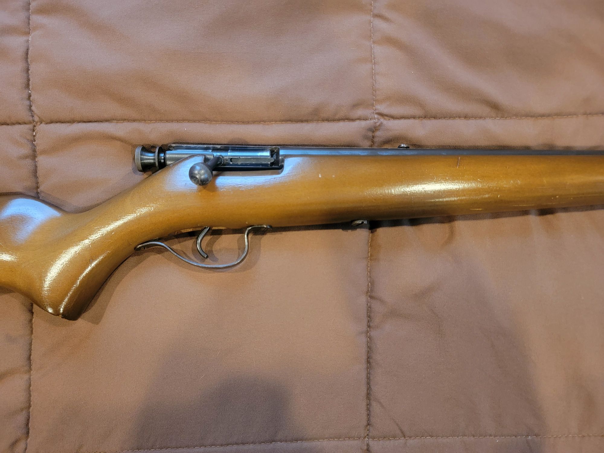 Bolt action, single shot, wood stockm, shows some wear, missing rear sight and rise. willing to negotiate or trade. +(BLOOMSBURG)