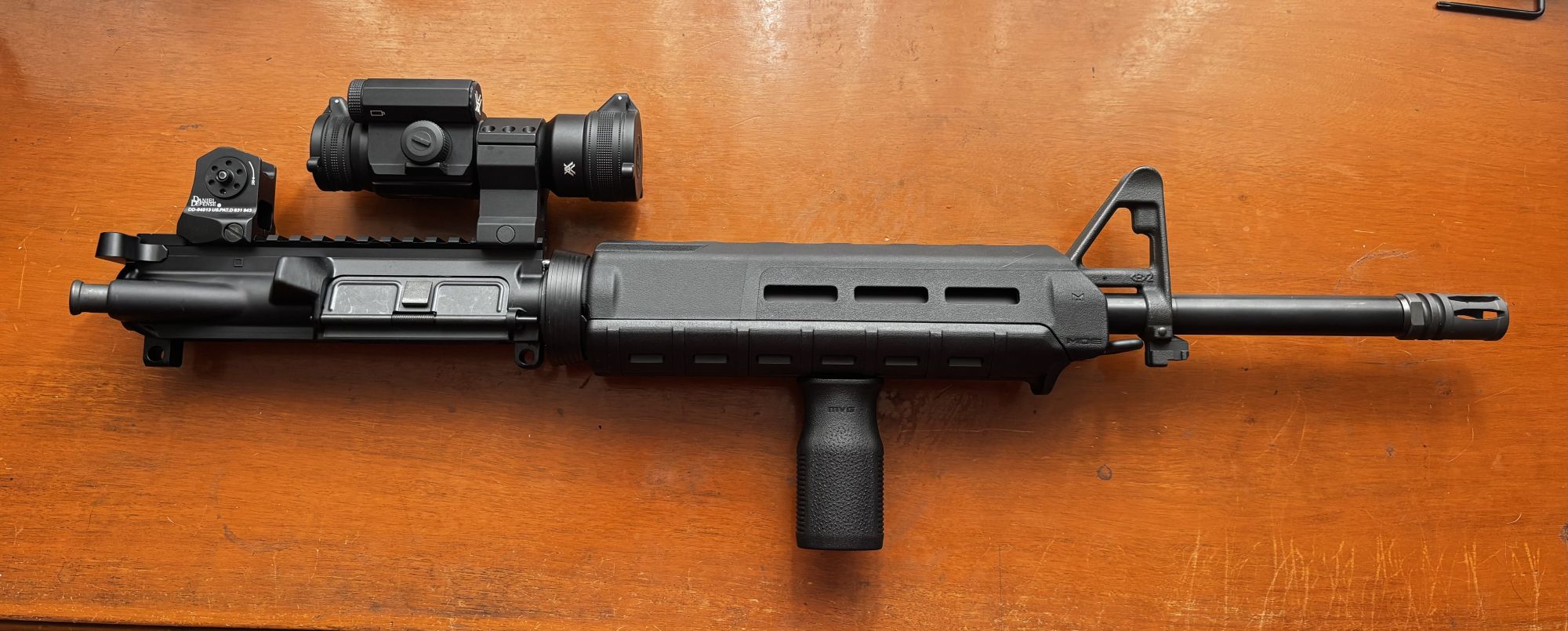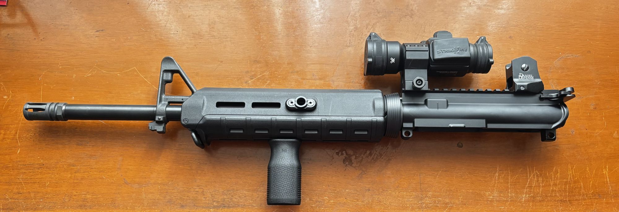Brand new, never fired, Magpul MOE, complete with BCG and charging handle, sling mount and vertical grip, $350.00 or with Vortex Strikefire with 2 mounts +(PLAINS) OBO
