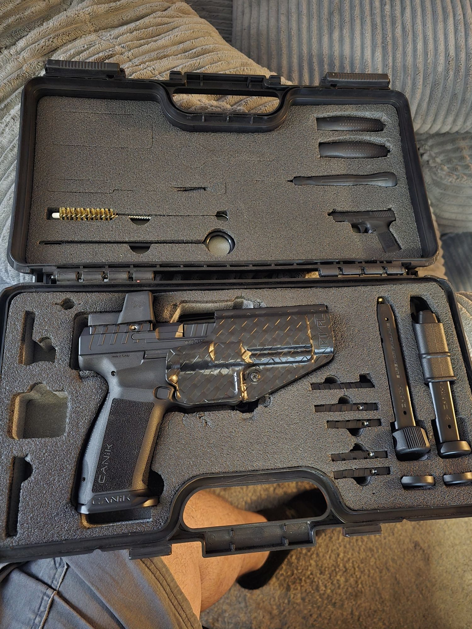 Brand new, in box, never shot, bought to use as entry level competition, never got around to it, with optic holster, multiple optic plaes, 2 additional back straps, 2-18 round magazines with multiple base plates, flared mag well, hard plastic case +(TAYLOR)