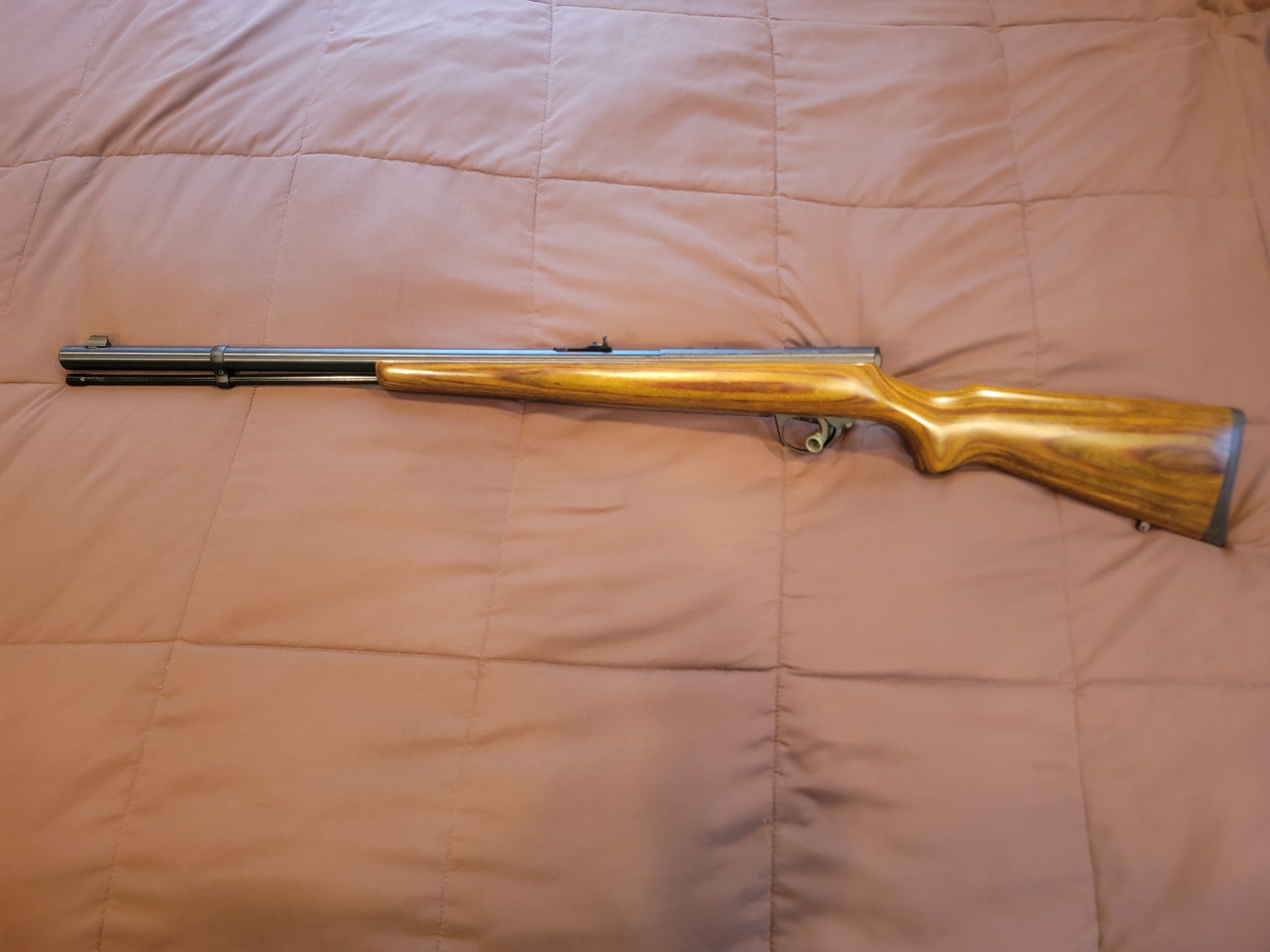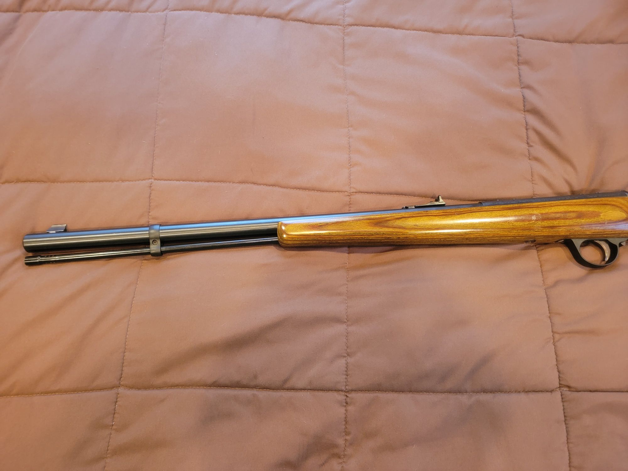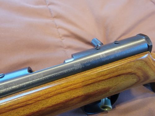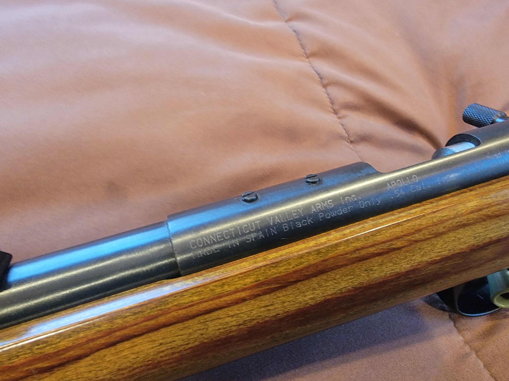 Wood stock, blued finish, 1:32 twist, factory drilled and tapped for scope mounts, excellent bore, takes #11 caps, with one pack of 100 caps. Serial number ending 97, not an earlier one that was recalled. Willing to trade, can add cash on top. +(BLOOMSBURG)