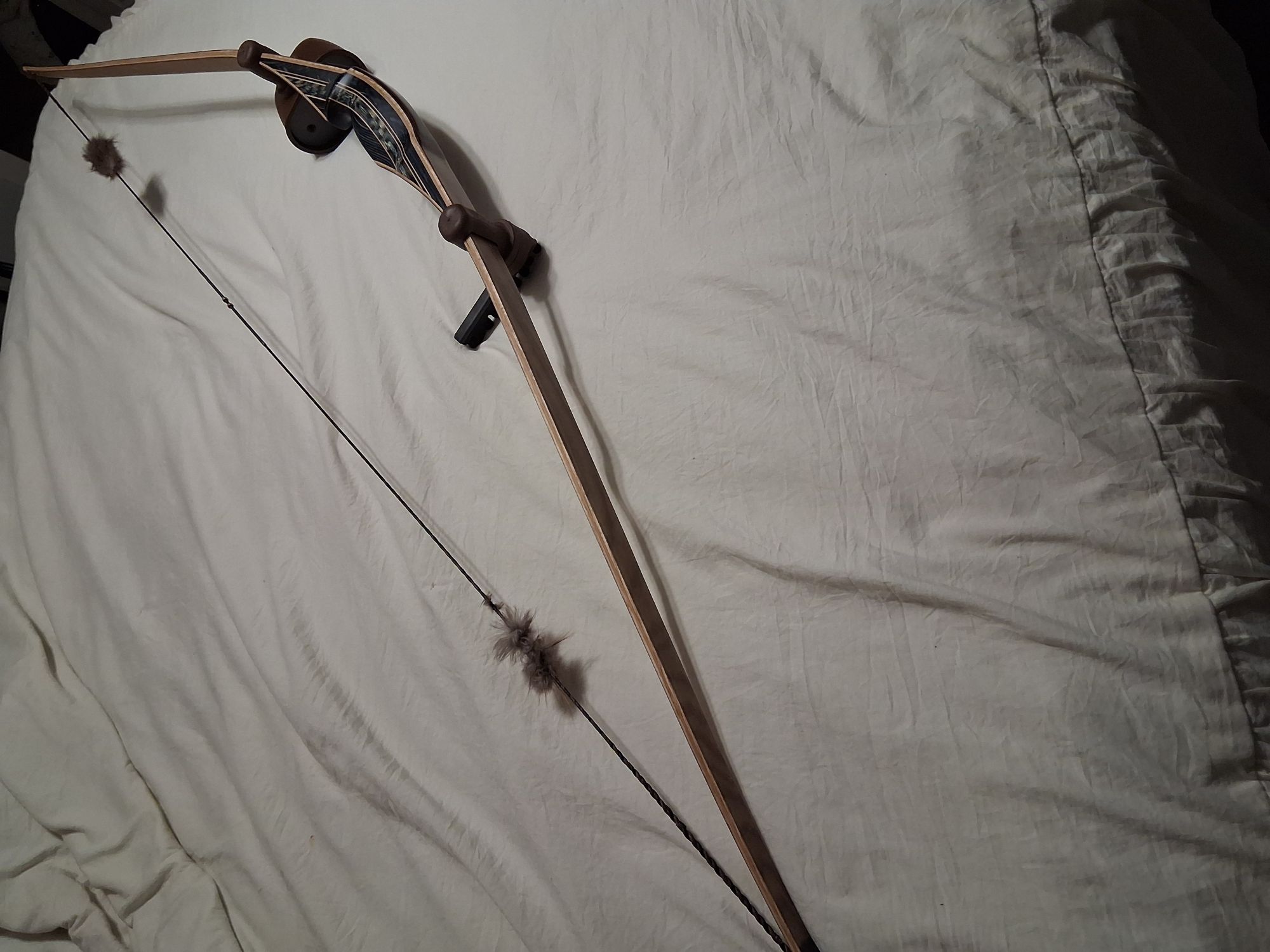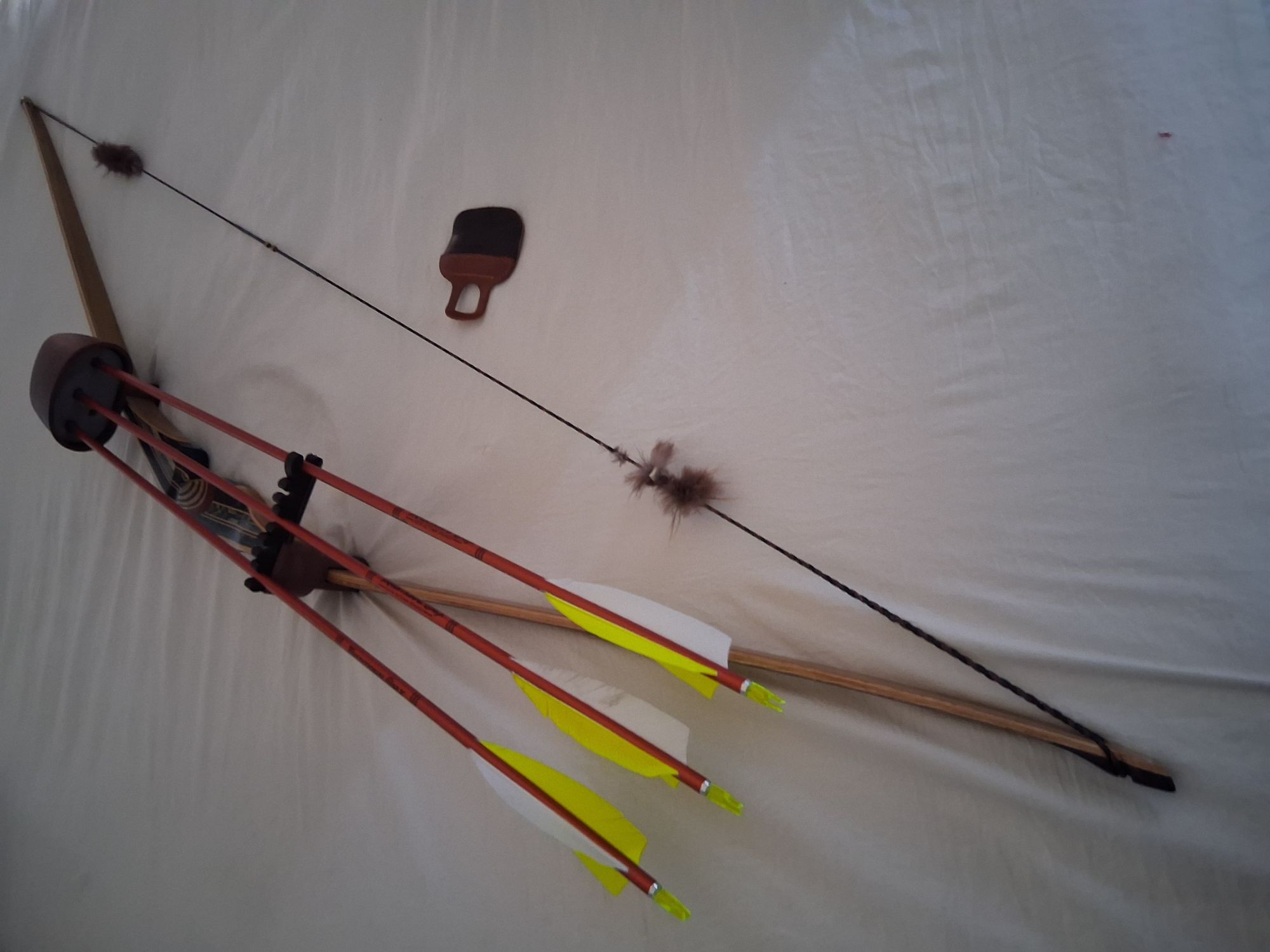 64", 45# draw, includes 12 XX75 autumn orange 2117 arrows, with field points and shield cut feathers, longbow stringer. 3 under tab release, will separate. Will consider trades+(NEW MILFORD)