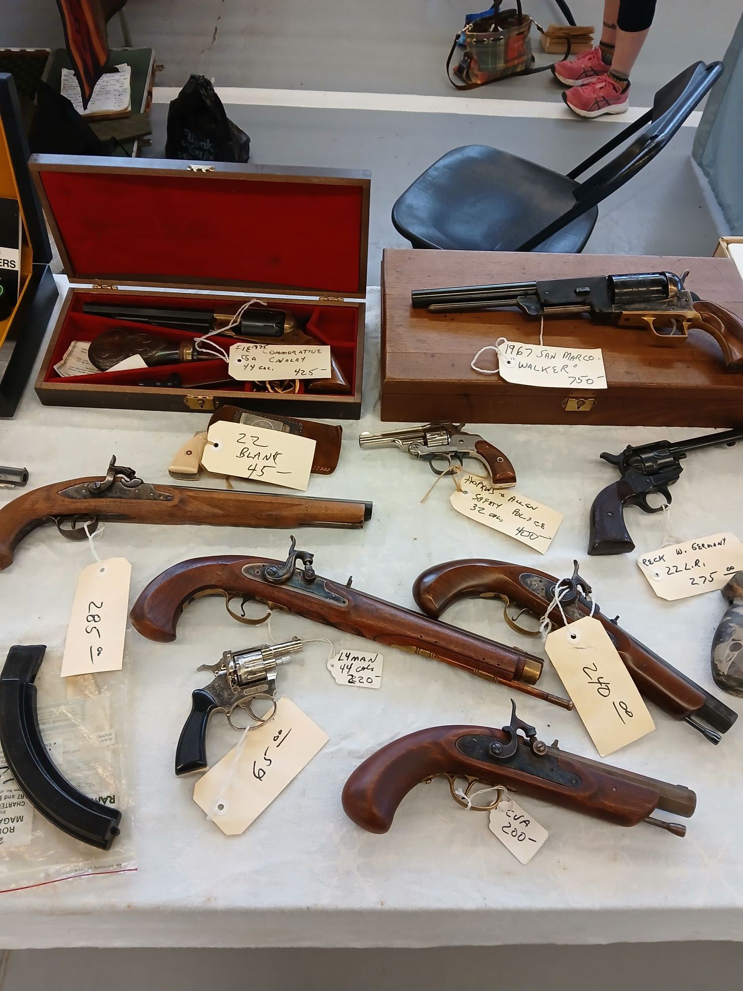 PERCUSSION HAND GUNS- Menoi 36 cal., $170.00; Philadelphia Derringer 44 cal., $340.00; CUA 50 Cal. Plains Pistol Kit, $150.00; Centaure Leige 42 Cal., $285.00; Lymban 44 Cal., $225.00; New Orleans Ace 45 Cal., smooth bore, $350.00; CVA Colonial 45 Cal., $200.00; Jukar 45 Cal., $240.00; Traditions Vortec 50 Cal. Inline, $400.00; Traditions Inline 50 Cal., with scope, $425.00; CVA 50 Cal. Mountain Pistol, $220.00; CMC 44 Cal. Boot Pistol, $160.00; MOVIE PROP GUNS- MGC Japan 8" 1873 Colt, $120.00; MGC Japan 6" 1873 Colt, $100.00; Flintlock with wire inlay, $100.00; Flintlock Pistol, $80.00; CAP & BALL REVOLVERS- 36 cal. Colt Copy, $100.00; Pietta 1858 Rem. 44 Cal., $320.;; Uberti Walker 44 Cal., $400.00; ASM 1868 Rem 44 Cal., $275.00; CVA 1858 Rem 44 Cal., 12", $320.00; 1967 San Marco Caseo Waler Set, $700.00; 80s Colt Pocket Navy 36 Cal. Caseo Set, $750.00; 1975 FIE Commerative CSA Calvarty, $425.00; Pietta 1858 Rem .44 Cal., 12", $320.00; Pietta 1858 Rem 44 Cal., $275.00; Kirts 45 ACp Cylinder for Pietta 1858, $250.00; CONTENDER BARRELS- Super 14 357 Herret, $250.00; 10" Bull 22 Rem w/MTS, $340.00; 14" 30-30 with MTS & forearm, $400.00; 80s Colt 1851 Navy 36 Cal., like new, $500.00; Prices are negotiable.+(NOXEN)