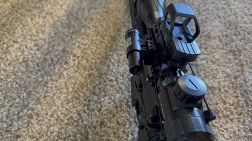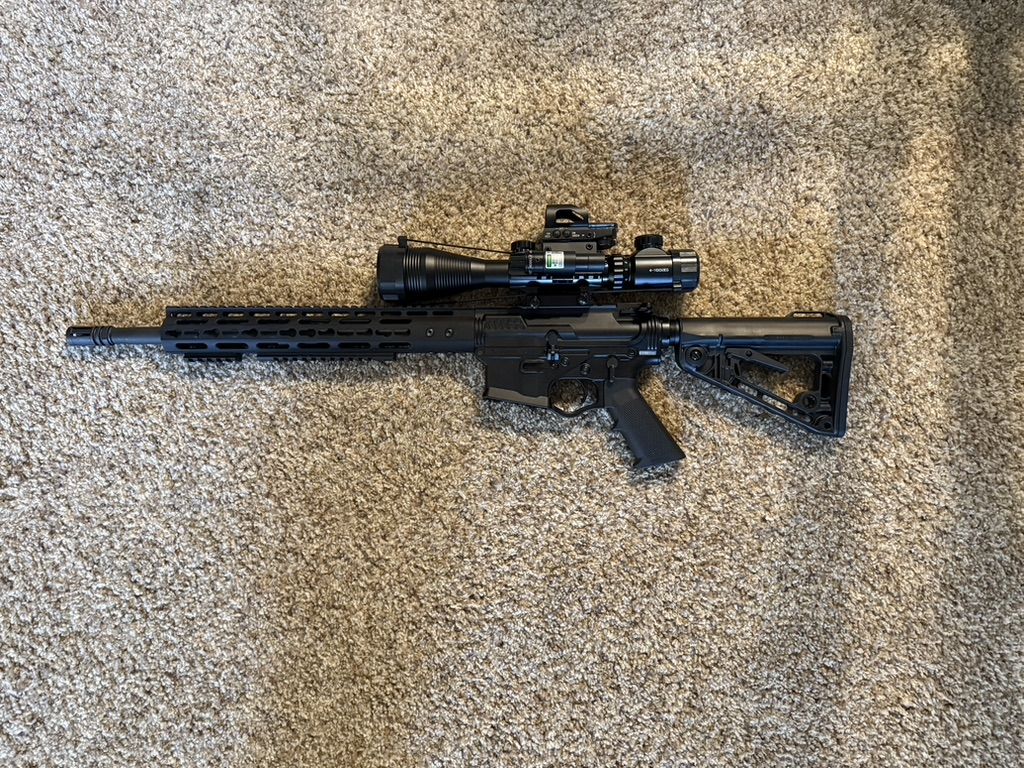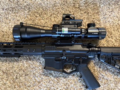 18' barrel, red/ green dot on top, green side laser, 4x16x50 scope, (2) 30 round mags, excellent condition +(BLAKESLEE)
