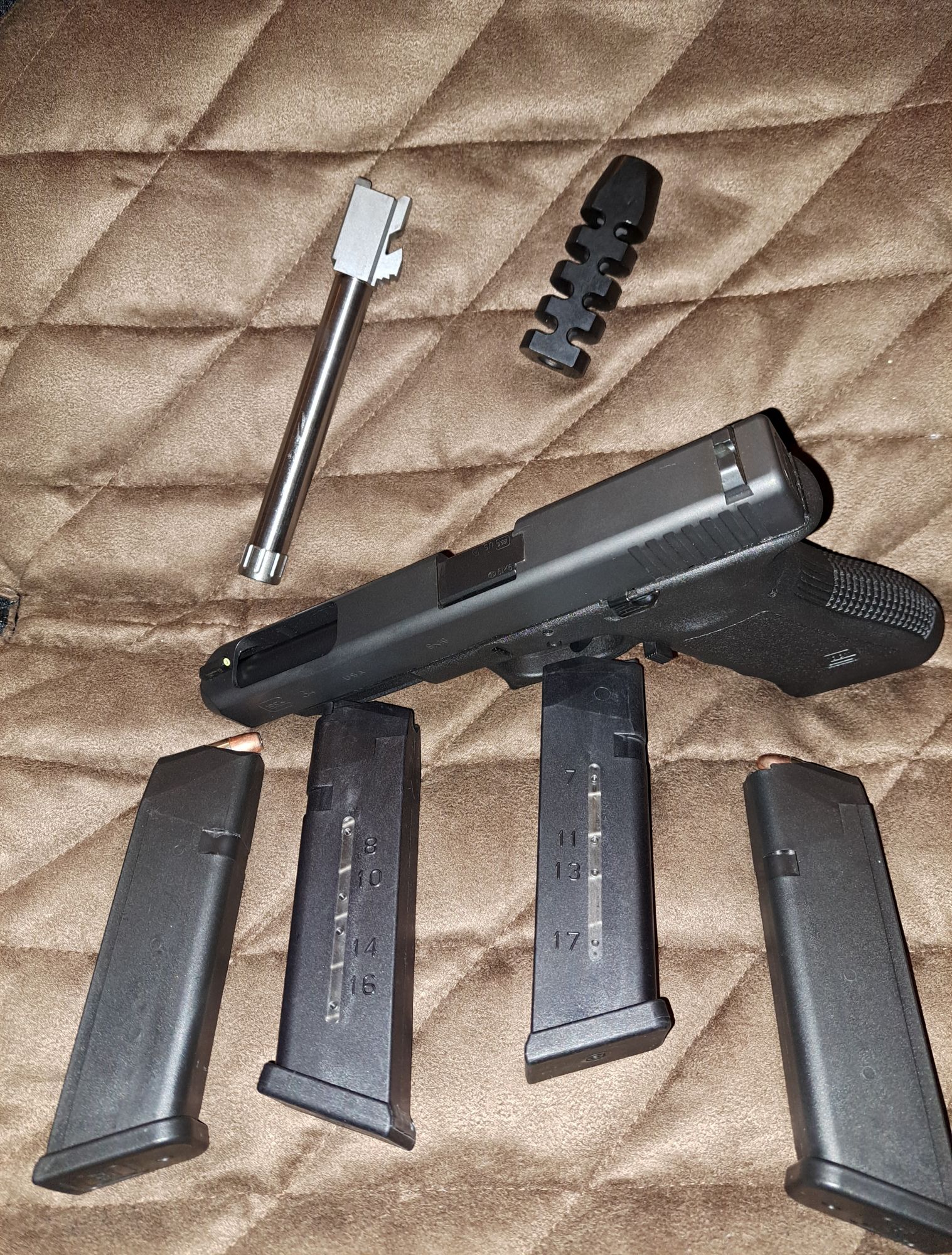 Like new condition, 50 rounds through, Glock performance trigger, extended slide release and magazine release upgrades, 9mm threaded stainless threaded barrel, Bowden tactical muzzle brake with four ports, threaded barrel protector when not using the muzzle brake (DICKSON CITY)