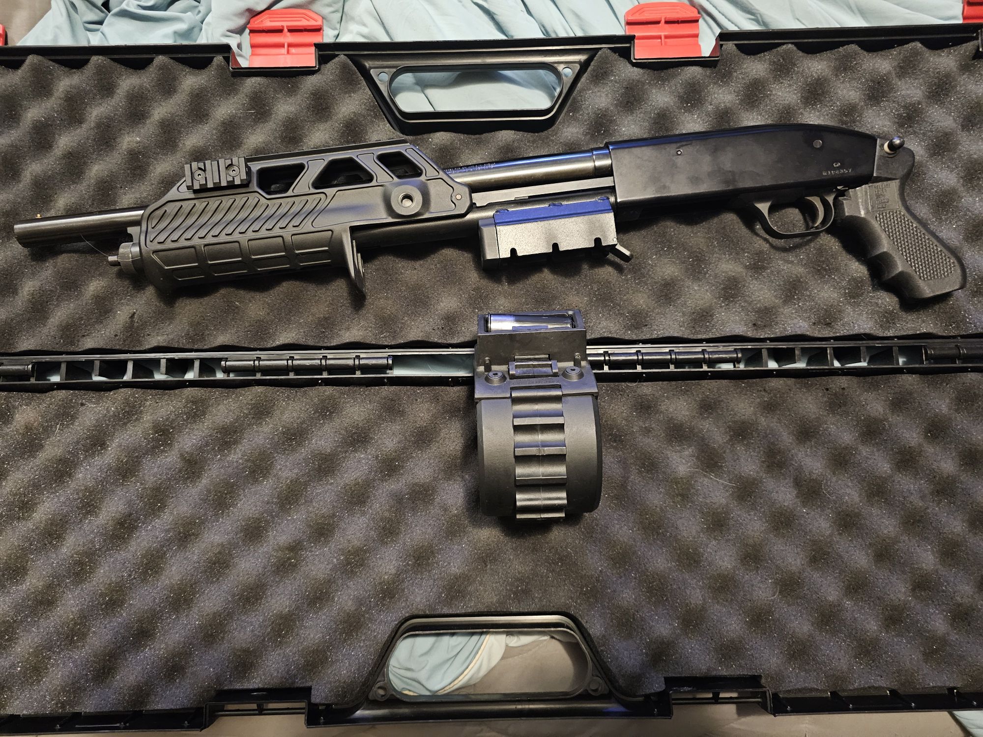 12 gauge, with ambidextrous 10 round drum mag. +(TAYLOR)