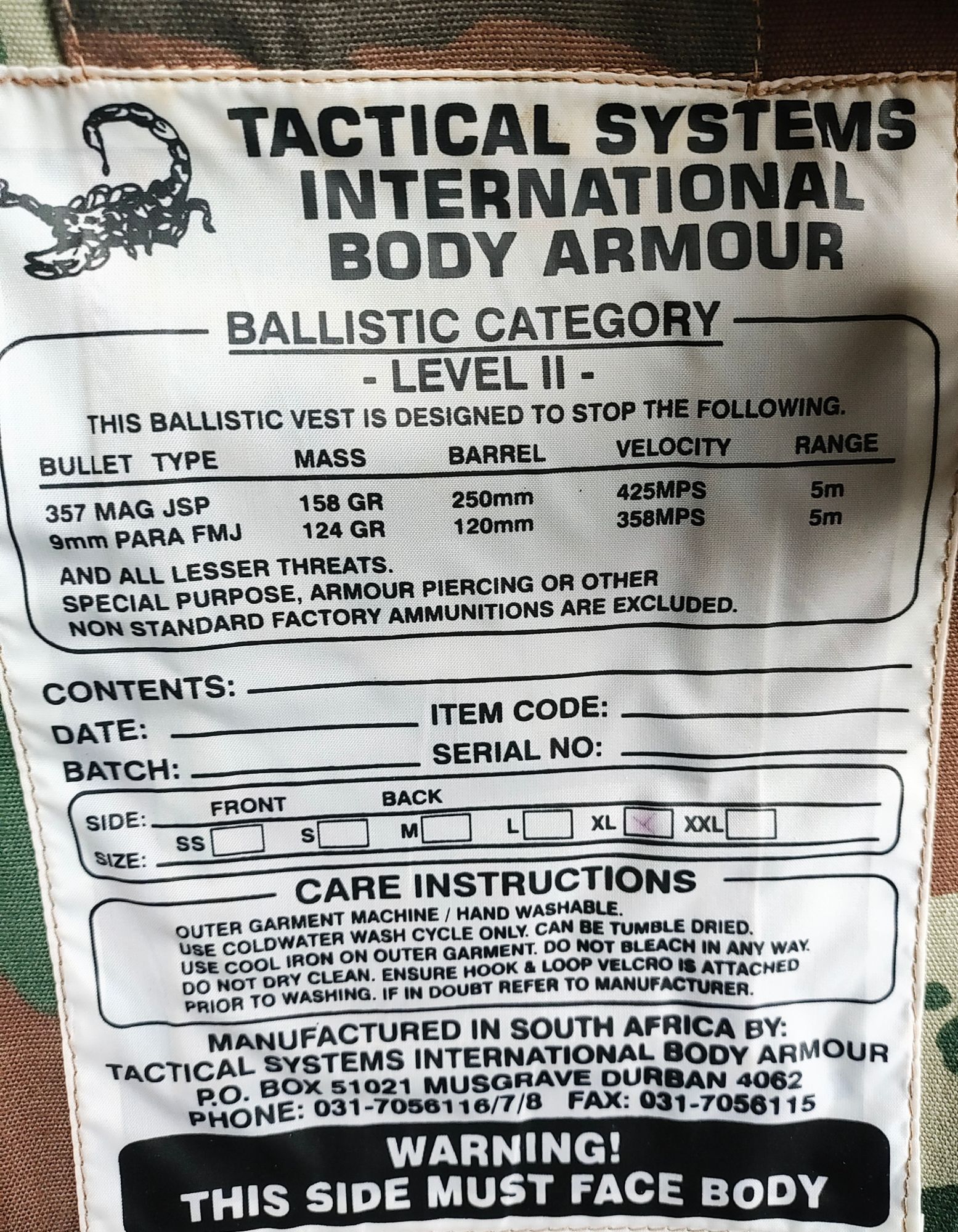 Excellent condition, bulletproof, South Africa National Defense Force, rated to stop 357 mag, rare Soldier 2000 camo pattern from mid 90s. Will accept ammo trades +(DICKSON CITY)