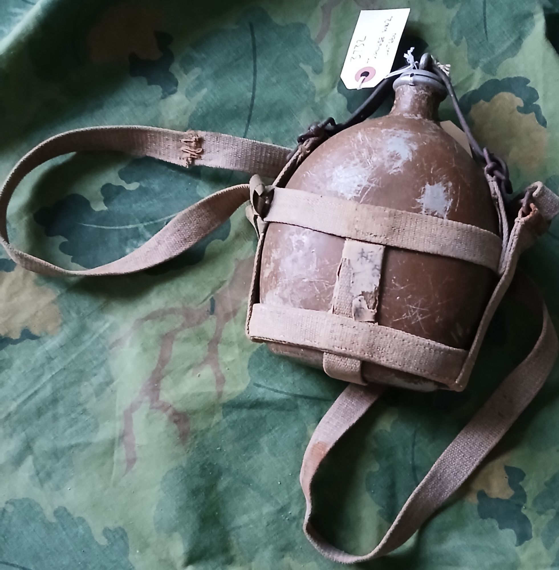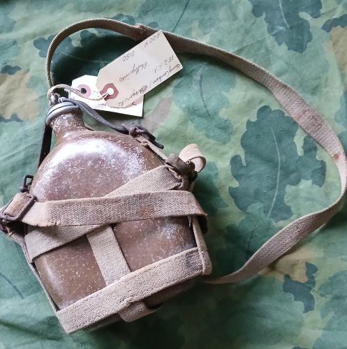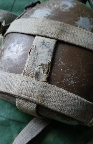 Authentic, with complete webbing and leather strap for the stopper, carried by most every soldier in the Imperial army, this round version replaced the model 1905 canteen from WW1, no holes or major dents, some WW2 era hand-done Kanji writing still visible. +(DICKSON CITY)