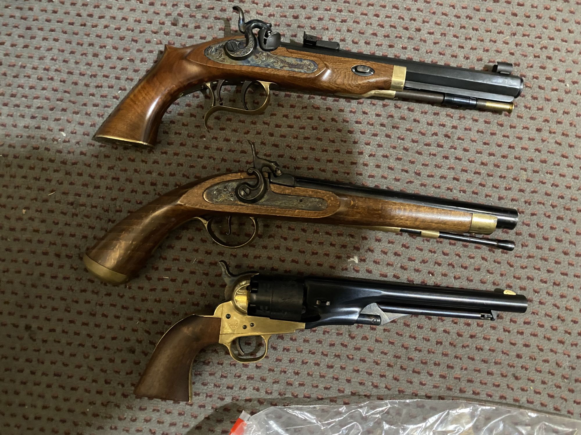 Thompson Center Arms, 45 cal., new; CVA reproduction Colt model 1860 Navy, engraved: 44cal Spanish reproduction model Kentucky percussion pistol 50 cal. +(THROOP)