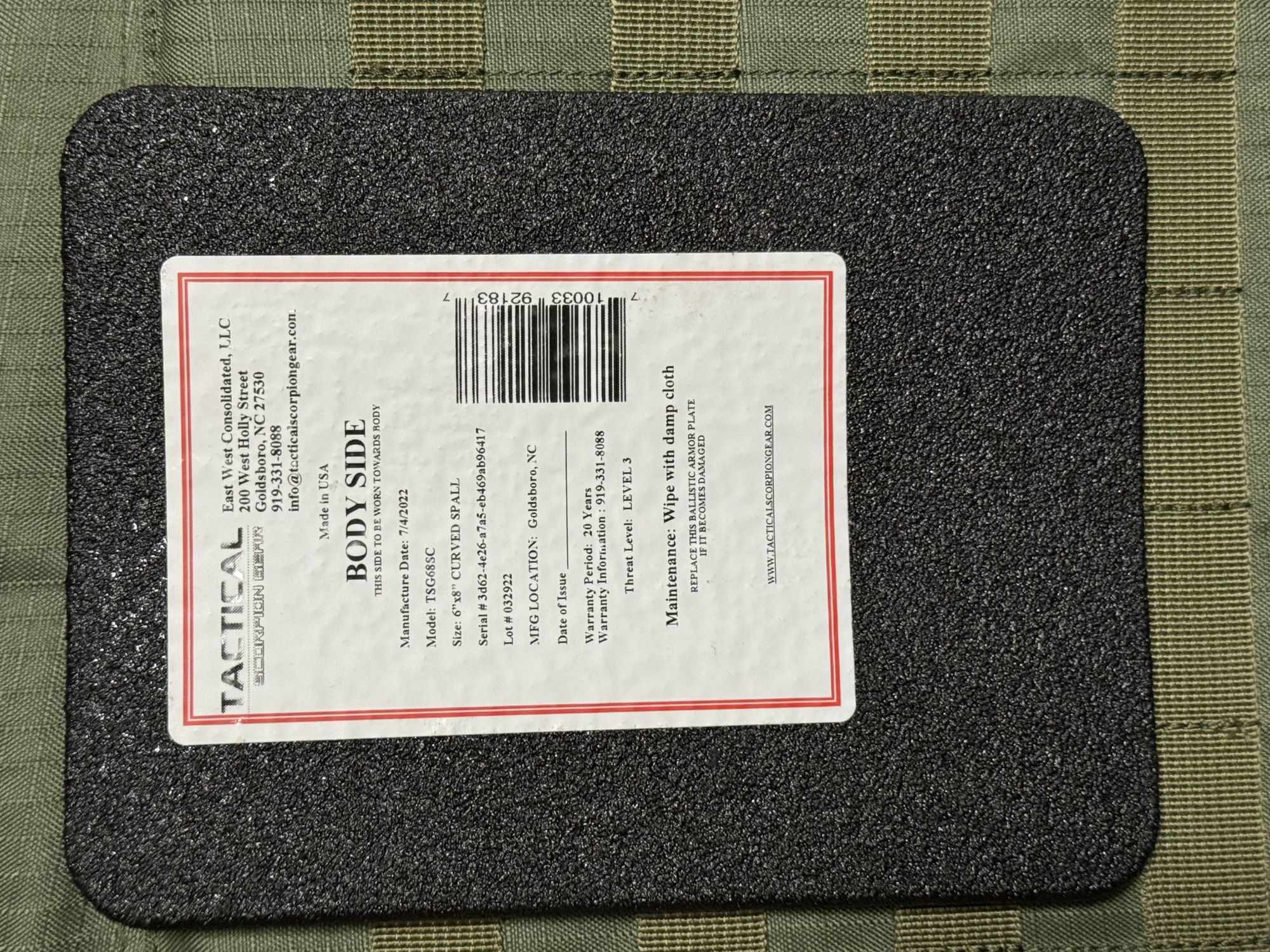 OD Tactical Scorpion Gear Muircat MOLLE carrier vest complete with curved armor plates and trauma pads. This vest provides protection for the front and rear plus both sides. Made of 600D and 1000D nylon. Heavy duty ITW style clips.. Easily and readily accepts all MOLLE accessories. Rated for up to six hits from 7.62 Nato bullets (.308 Winchester) with velocities up to 2780 fps. 2022 New, Unused, Never Worn +(HALLSTEAD)