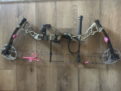 great youth bow or small statured shooter, was my wife’s first bow hence the pink accents, with three pin sight, trophy ridge stabilizer, whisker biscuit, and wrist strap. Will consider trades for hunting or archery equipment, 5-55 lbs. draw weight, 18" - 30" draw, 295 FPS, axle to axle 31" +(SCRANTON)