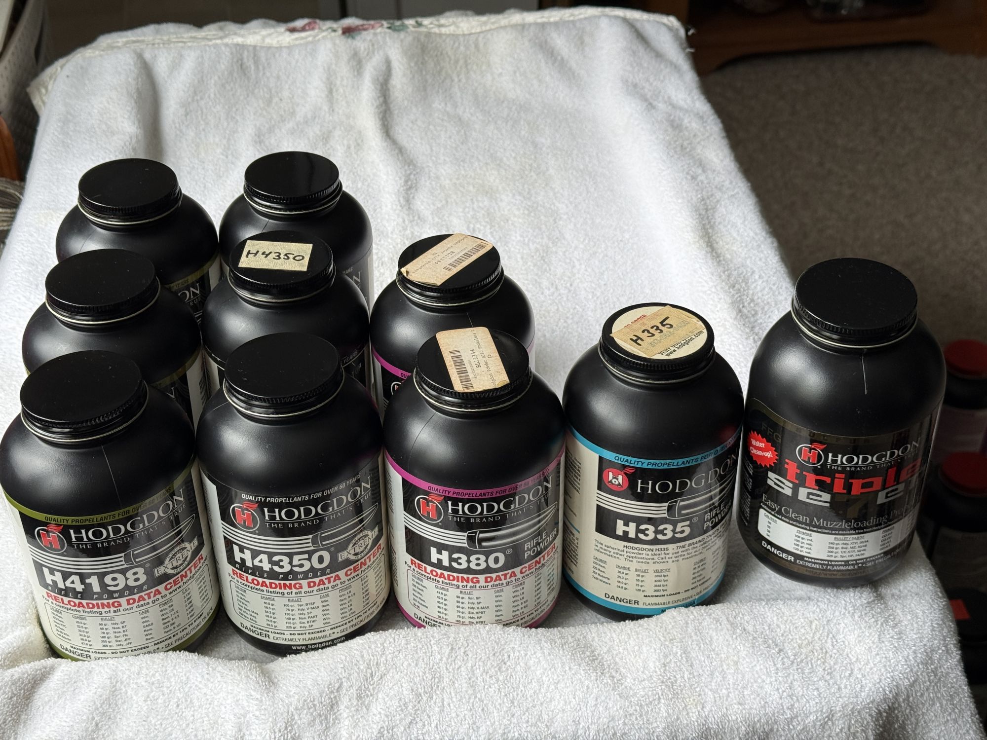 (3) H4198 $5.000 Ea; (2) H380 $40.00 Ea; H335 $40.00; Triple 7, $40.00; All sealed containers. +(OLYPHANT)