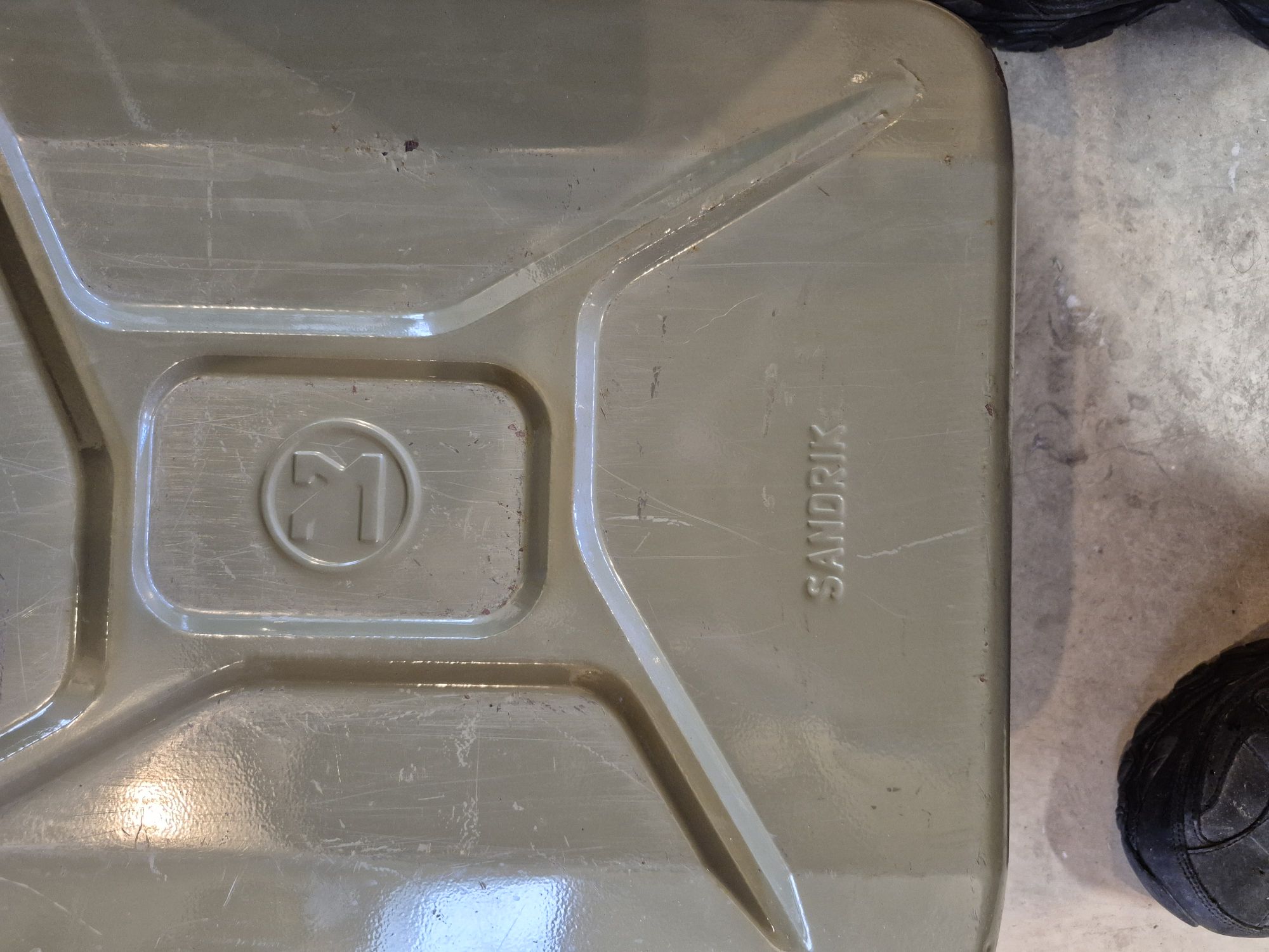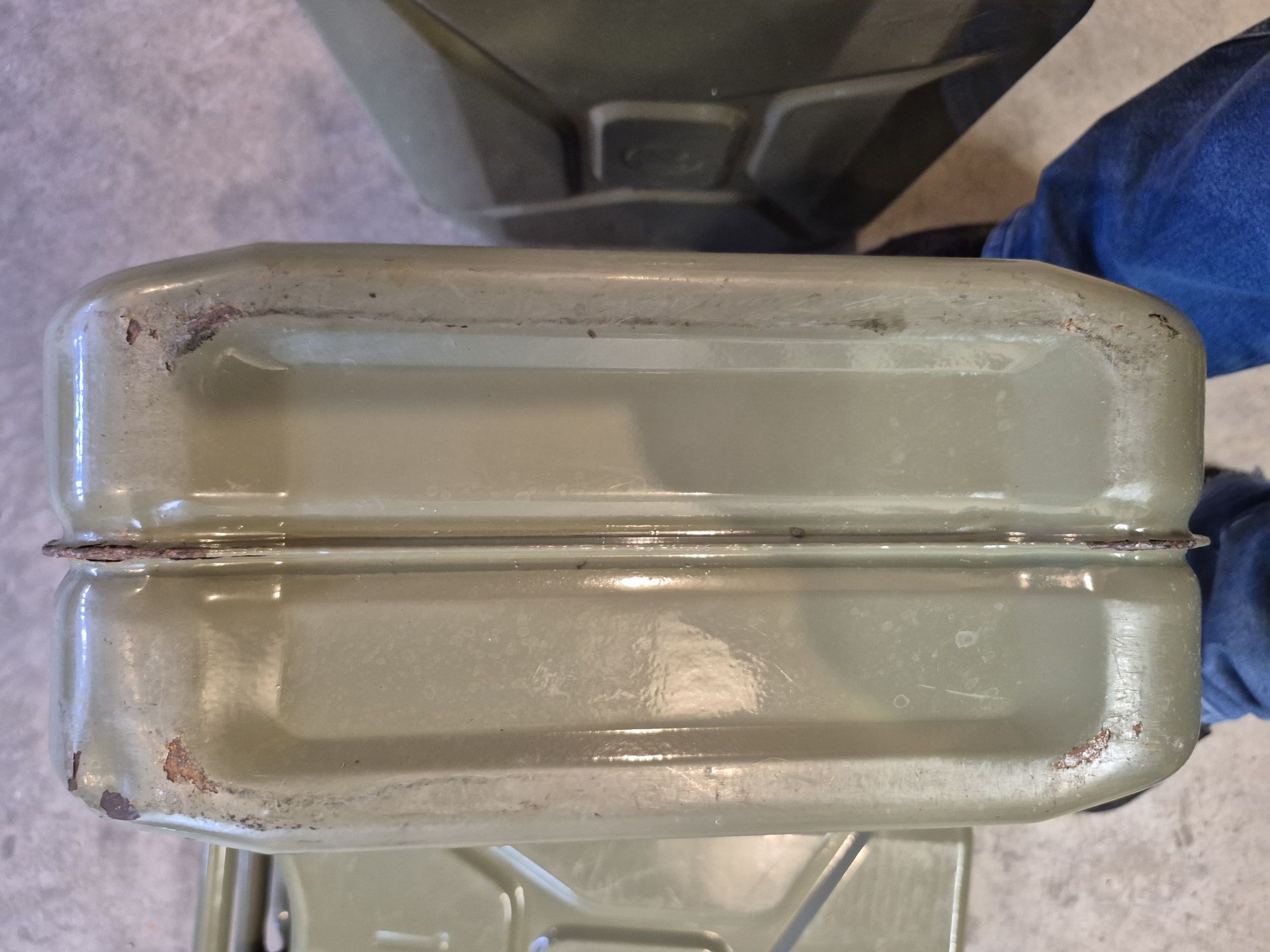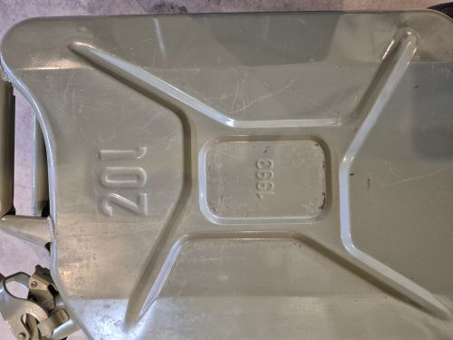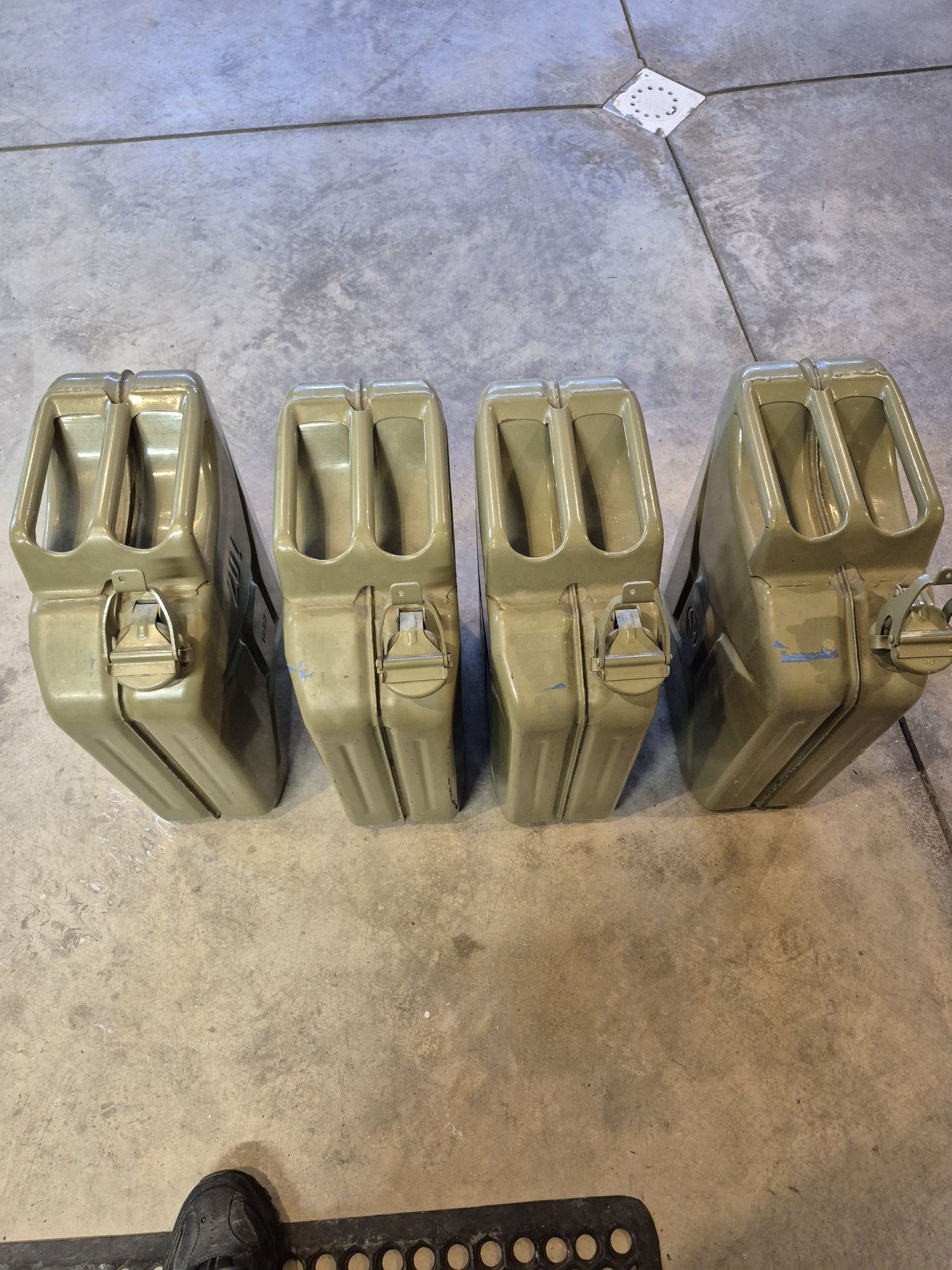 4-vintage German military surplus 20-liter (5.3 gal) gasoline cans, feature German designed 3-handle carrying system, manufactured in 1993, in very good condition, seals are good and only minimal, slight surface rust on small paint scratches, no dents, +(TUNKHANNOCK)