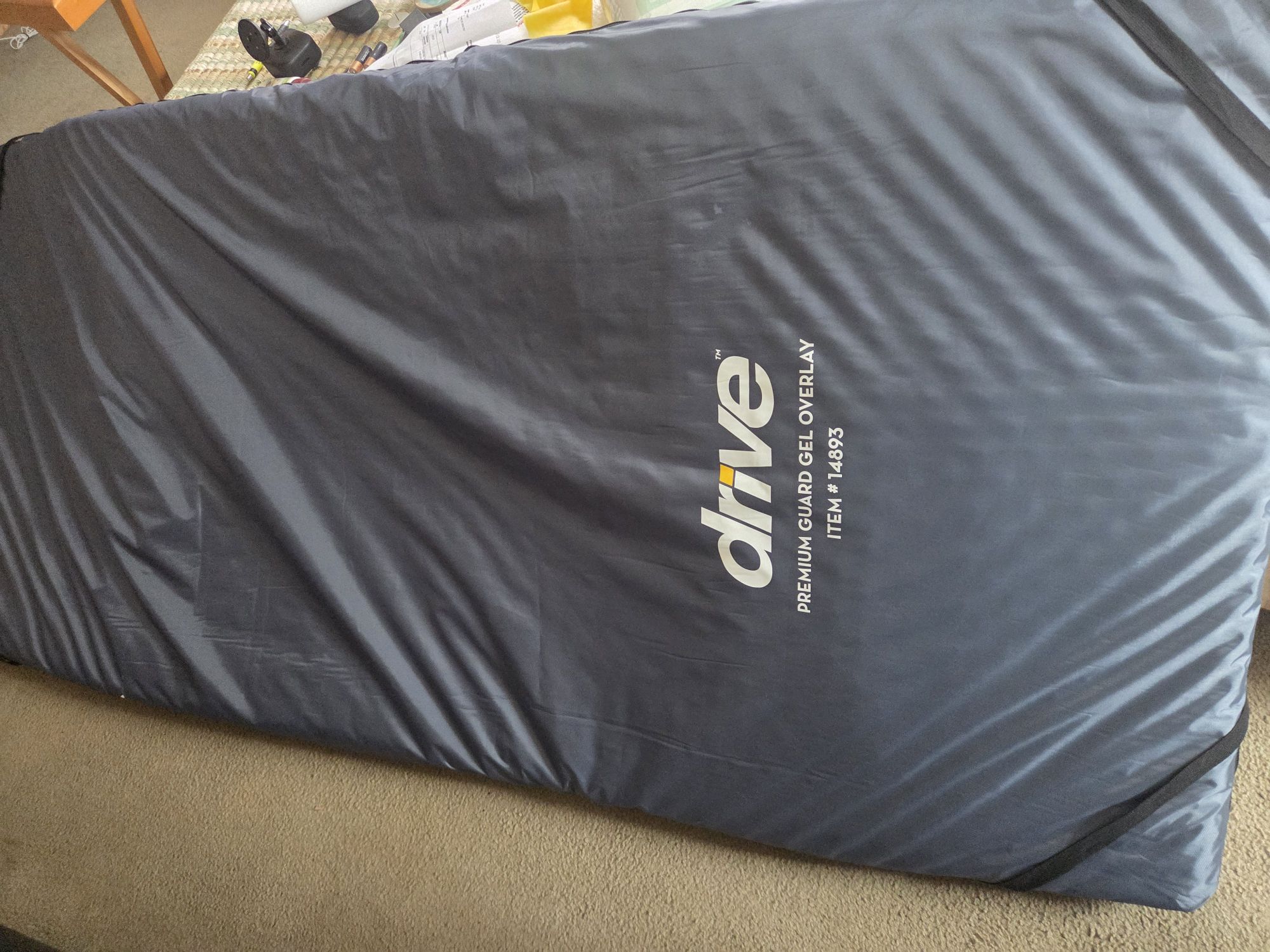 Brand new, never used, improves patient comfort and air circulation with convoluted polyurethane foam topper vastly, optimizes pressure redistribution, full-length, head-to-toe gel bladders minimize bottoming out and pitting, supports weight up to 300 pounds, fits most twin-sized mattresses measuring 34"x 76"x 3.5", (86.4 cm x 193 cm x 8.9 cm), designed with 15 gel bladders covering the entire patient contact area for the prevention and treatment of pressure ulcers, secures to mattress with four elastic corner straps, water-resistant and vapor-permeable, urethane-coated polyester cover unzips for easy washing, stain and water-resistant vinyl base, zippered cover makes it easy to wash, bladder contains an aqueous, non-toxic gel and polystyrene beads to minimize gel migration, meets flammability standard TB117, wipe down the overlay with a damp cloth pre-soaked with warm water containing a mild detergent, approved intermediate level disinfectants may be used according to the cover material, cover can be completely removed for laundry with water temperature up to 95F; however, not made with natural rubber latex +(LITTLE MEADOWS)
