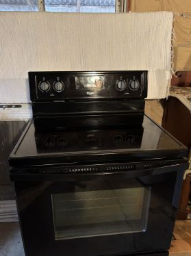 with glass cooktop, self-cleaning oven/ bottom storage, small chip on cooktop not affecting stove performance, very good condition, +(DALTON)