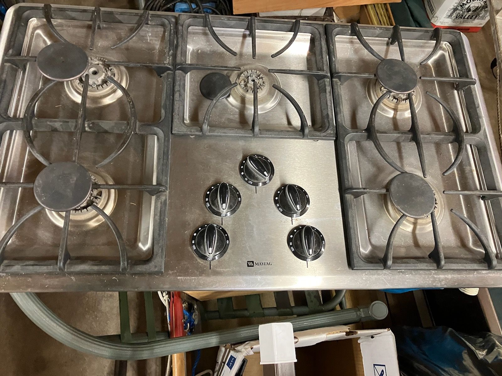 LP or natural gas, 5-burners, 20"W.x 36"L., w/plug-in electronic light, new $600.00; works perfectly, +(OLD FORGE)