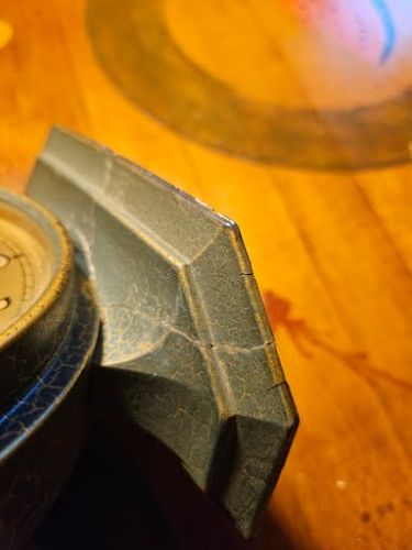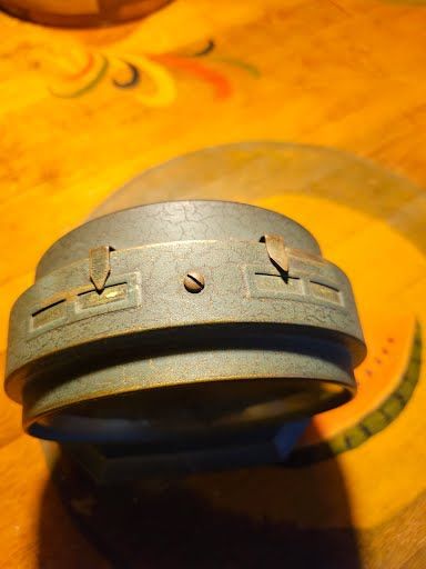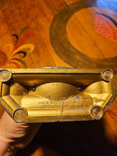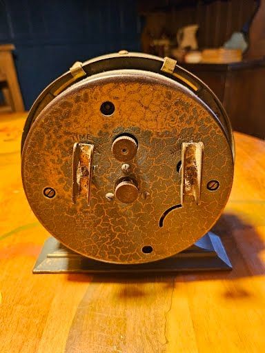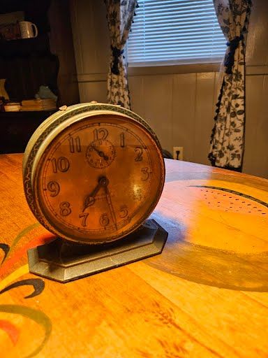 Antique timepiece, prominent Art Deco model from the late 1920s, this specific design was manufactured starting around 1927 and was discontinued in 1930, were known for their colorful crackle or crinkle finishes, this model was originally available in hues like green, blue, and old rose, features mechanical spring-driven movement with a secondary alarm setting dial located at the top of the main face, base was repaired at one time. Cash only +(SCRANTON)