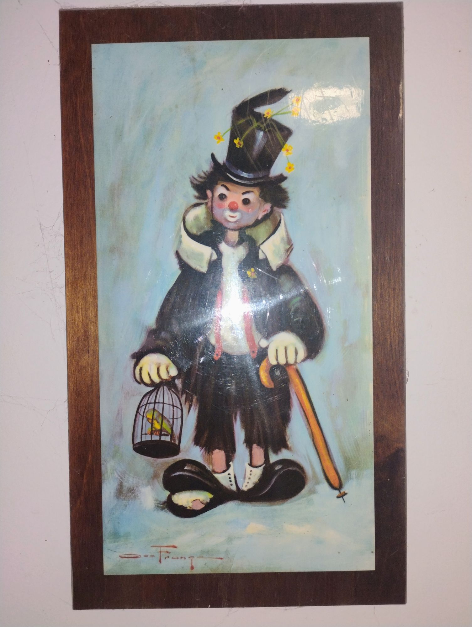 Vintage, oil or acrylic painting, on board, features whimsical clown holding a birdcage and a cane, signed by Franca in the bottom left corner, set in a dark wood frame with a vertical orientation, primary colors are blue, black, and brown. +(SUNBURY)