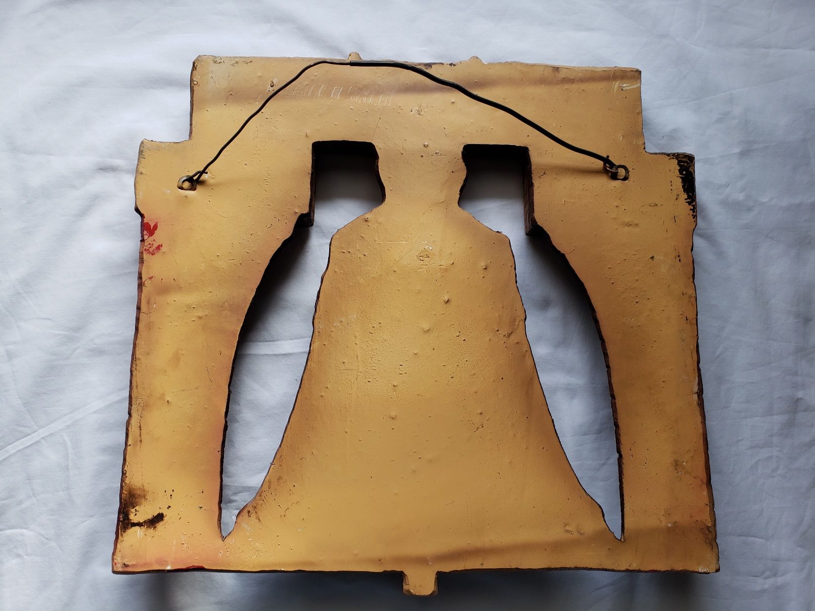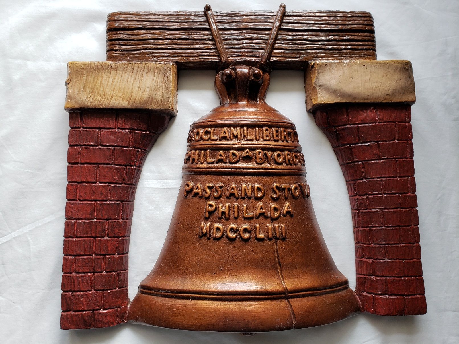 vintage Liberty Bell replica wall hanging plaster chalkware plaque from the 1970s. The plaster plaque measures approximately 16 and 1/4 inches wide by 15 inches tall. $10.+(RANSOM)