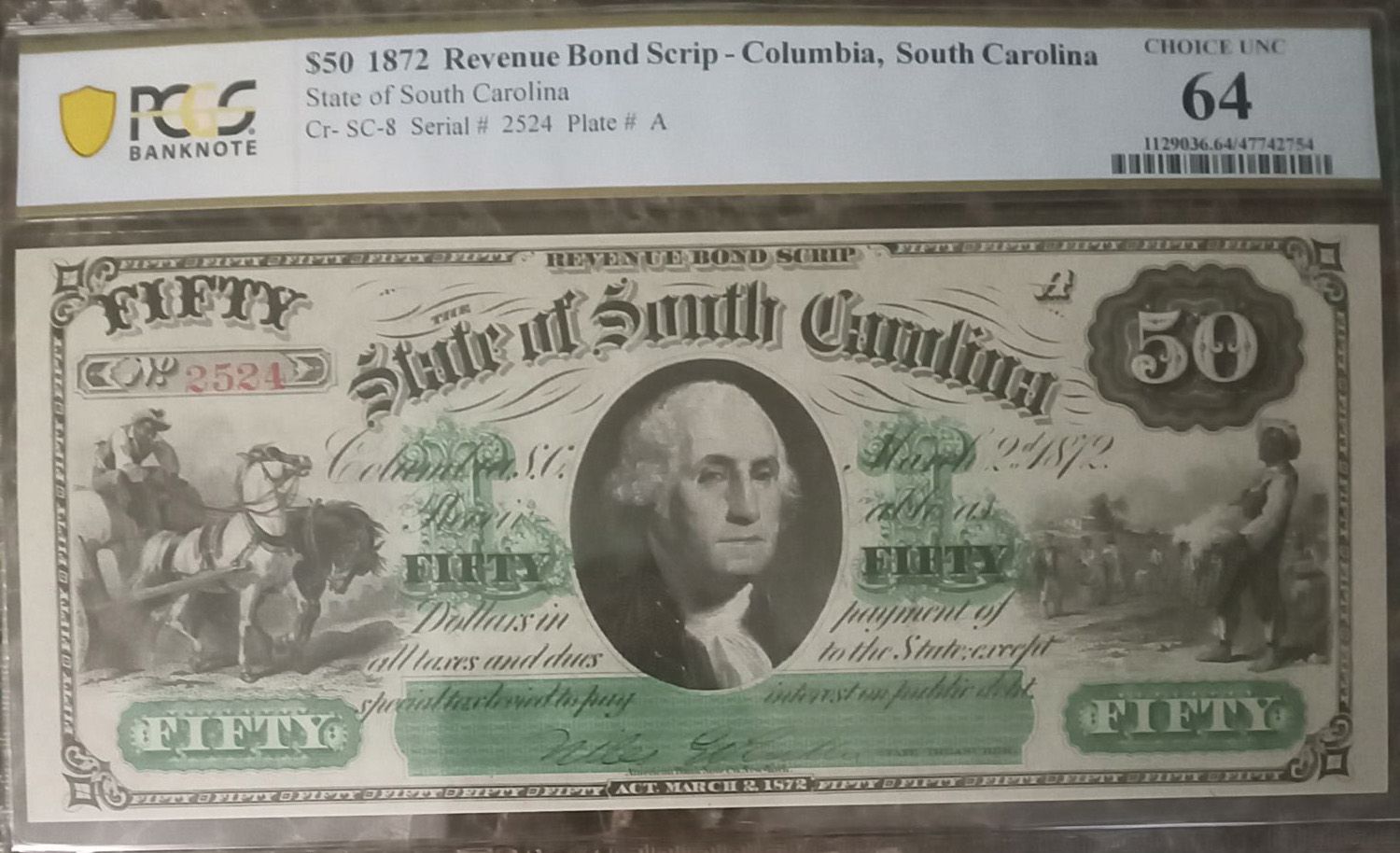 graded 1872 South Carolina $50.00; graded 1963 Joseph Barr one dollar bill 5 in a row serial number, very rare 1887 double struck Morgan Dollar Fred Weinberg privately minted, very rare Morgan Dollar. +(HANOVER TWP) Call or text with offers.