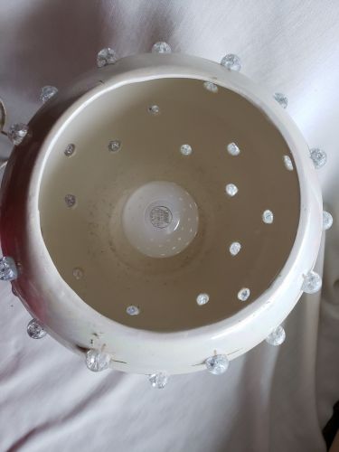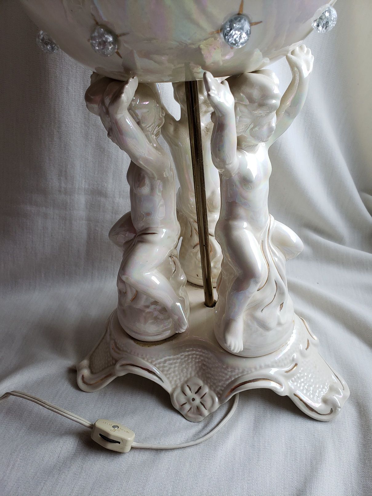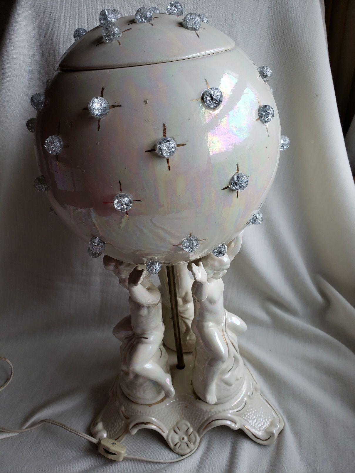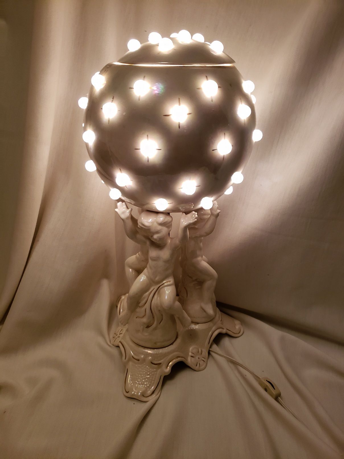 from the 1970s, light shows through the clear glass bulbs located around the outside of the globe, base of the lamp features 3 cherubs that are holding the globe up, top of the globe lifts off to access the bulb. +(RANSOM)