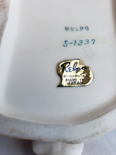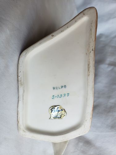 made in Japan by Relpo in the 1950s, hand-painted design, good condition, ideal for holding small indoor plants or flowers, measures approximately 6-1/2 inches long, 4-3/4 inches tall, 2-3/4 inches wide. +(RANSOM)
