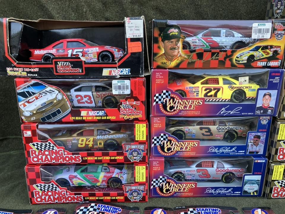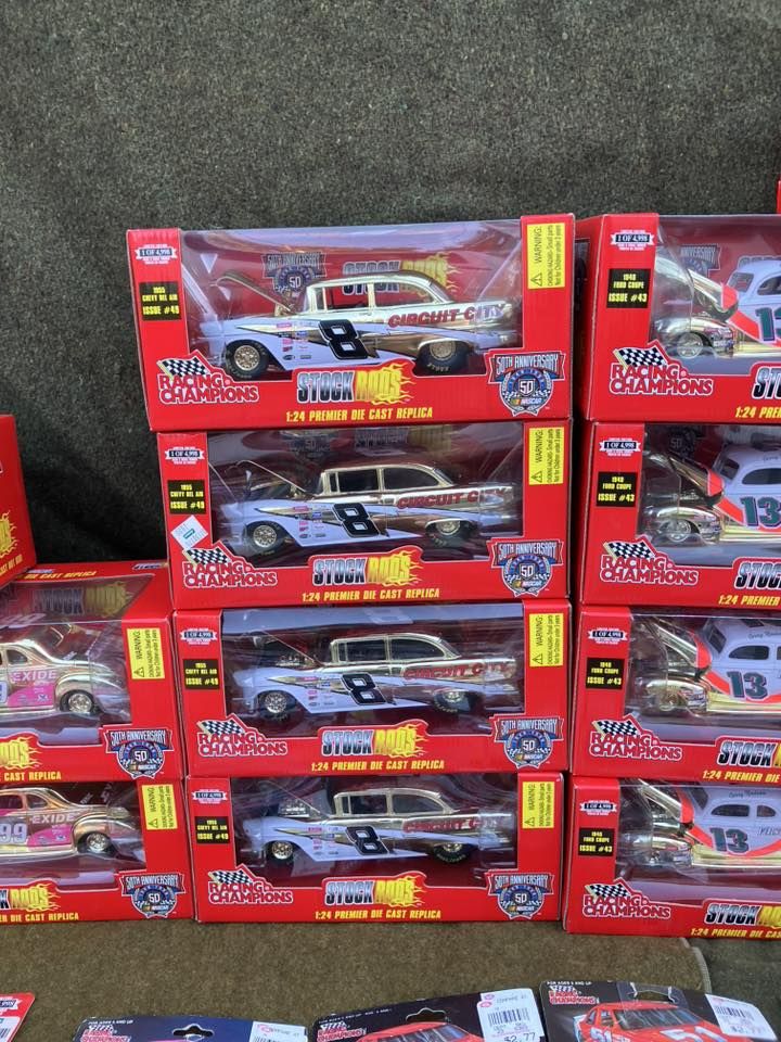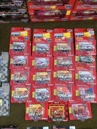 127 assorted pieces, new in box, bought back in the late 1990s and stored away ever since, (50) 1:24 scale cars, some duplicates, Stock Rod Series; (5) #99 Exide, (4) #8 Circuit City and (8) #13 FirstPlus; (2) gold series #9 cars, remaining are 1:64 scale, must take all +(DALLAS)