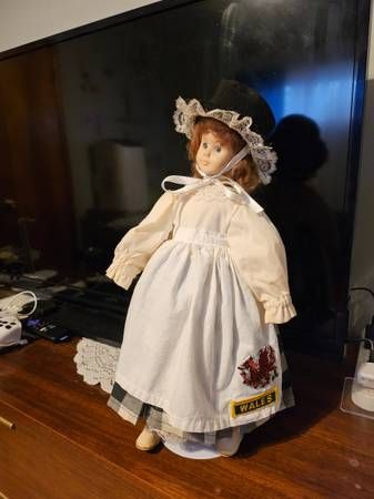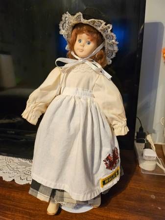 dressed in a traditional Welsh costume, identifiable by the tall black felt hat (the "cockle hat"), lace-trimmed bonnet, and white apron featuring a Welsh Dragon emblem and "WALES" patch, popular collectors items and souvenirs, often depicting Victorian-era styles, with extra dress, hat and stand. Cash only +(SCRANTON)